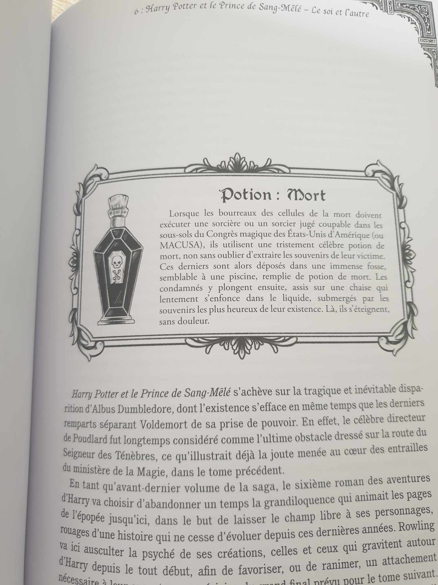 Tout au long de votre lecture, vous aurez également des explications concernant les baguettes de chaque sorcier, plus ou moins important au sein de la SAGA, notamment Harry Potter, Drago Malefoy… Poudlard est également bien décortiqué avec l’évolution de la célèbre école de magie tout au long des différents tomes/films de la SAGA. Les potions occupent également une part importante au sein de ce livre, avec en bouquet final, le Prince de Sang-mêlé. Enfin, les Horcruxes seront également de la partie, élément indispensable concernant Harry Potter. Dumbledore dispose également de sa part tout au long du livre, avec les célèbres citations du directeur de Poudlard, dispersées un peu partout durant la lecture.