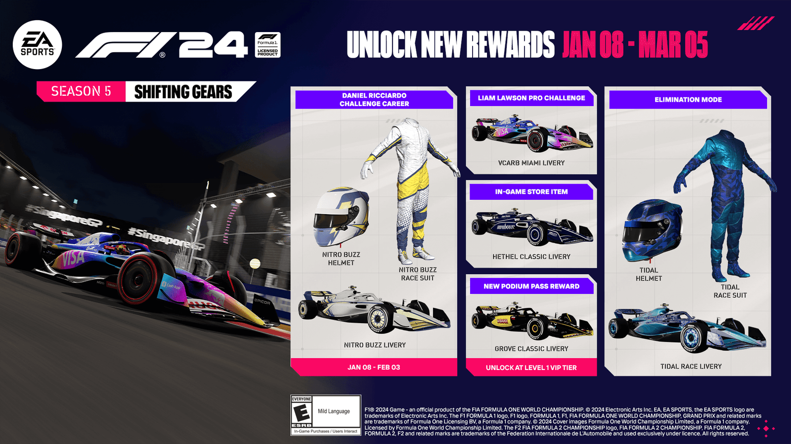 S’intitulant Changement de vitesse, cette nouvelle saison de F1 24 va permettre aux joueurs, de découvrir un superbe hommage au pilote Australien, Daniel Ricciardo. Un programme très complet vous attend, avec quatre épisodes et huit circuits, dont chacun sera l’occasion de se remémorer la carrière de Daniel Ricciardo. Cet hommage, sera disponible à partir du 8 janvier prochain, et sera accessible jusqu’au 3 février prochain. Ce n’est pas le seul ajout de cette 5ème saison. Un défi pro en lien avec Liam Lawson sera également de la partie, à partir du 8 janvier prochain, jusqu’au 5 mars prochain. Durant ce défi, vous allez devoir réussir à battre son chrono au sein du Circuit urbain de Singapour ! Les joueurs qui y parviendront, vous pouvoir s’offrir la livrée de l’écurie pour l’édition 2024 du Grand Prix de Miami.