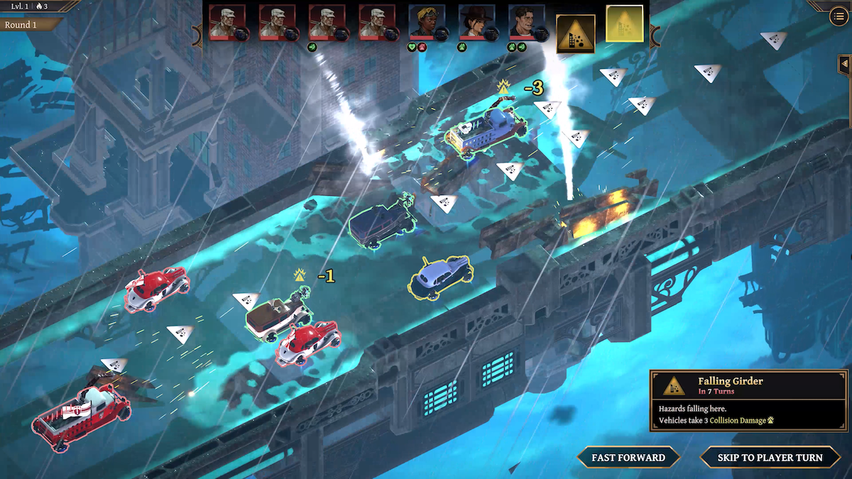 Mais ce qui fait surtout la spécificité d’Aether & Iron ce sont ses combats. Certes ils reprennent les codes classiques du RPG tour par tour mais ils ont un twist. Ils se font en voiture volantes. Ainsi vous affrontez vos adversaires à coups de mitraillettes, lance-flammes ou autres diffuseurs de fumée le long de course-poursuite débridée dans une ville aux relents steampunk. Avouez que ça a son charme.