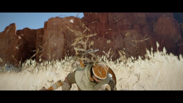 Dans un premier temps, parlons du scénario et de la mise en scène proposés dans Crimson Desert. Dès les premières minutes, le ton est donné ! Notre protagoniste semble plongé dans une situation de perdition totale. Alors qu’il partage un moment de calme avec ses compagnons, tout bascule brutalement avec l’arrivée de mystérieux hommes-ours, bien décidés à semer le chaos. C’est dans ce contexte que vous découvrirez vos premiers affrontements, arme en main. Vous incarnez Kliff, membre du clan des Crinières Grises. Très rapidement, la situation dégénère, et votre groupe se retrouve dépassé par une menace bien trop puissante. Kliff perd alors l’ensemble de ses compagnons dans une bataille aussi violente qu’impuissante … Avant de reprendre difficilement ses esprits. C’est ici que votre aventure commence réellement, au cœur du vaste monde de Pywel. Les premières minutes, voire les premières heures, risquent d’être particulièrement éprouvantes pour de nombreux joueurs. Le jeu se montre exigeant dès le départ, avec une sensation constante de devoir se débrouiller seul. Fini les marqueurs omniprésents ou les indications précises, ici, il faut observer, comprendre et expérimenter.