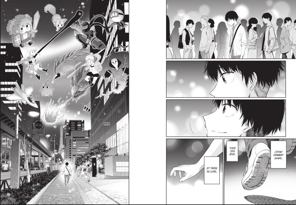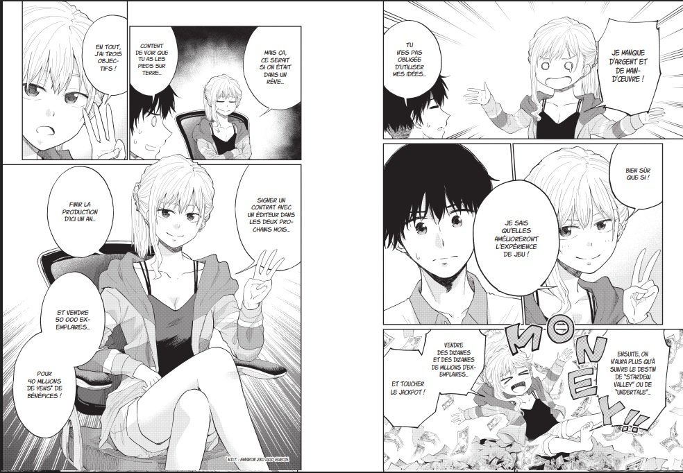 Si l’on énumère en partie ce qu’il se passe dans le manga, on évite de tout vous spoiler, mais il n’est pas toujours évident de faire une critique sans parler du scénario surtout qu’ici, il n’y a pas de monstres, pas de combattants, mais une histoire sur le réel. On apprécie que le récit s’oriente vers le monde du jeu indé, souvent idéalisé, mais que le manga semble vouloir montrer avec nuance : liberté créative, certes, mais aussi instabilité, pression financière et doutes permanents. L’œuvre se présente comme une véritable lettre d’amour au jeu vidéo , et c’est probablement sa plus grande force. Mais loin d’être naïve, cette déclaration d’amour est teintée de réalisme. Le manga explore :