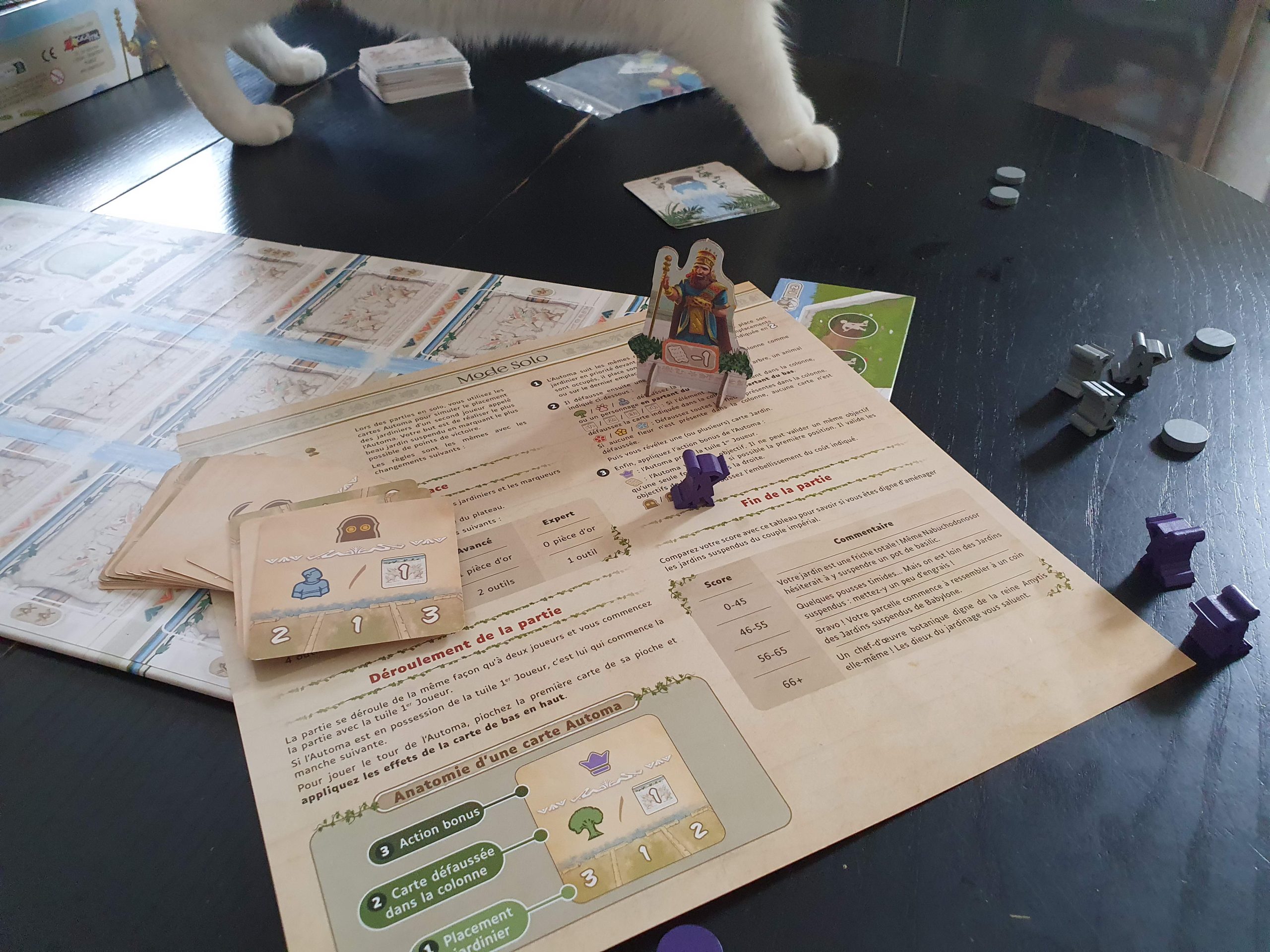 Comme l’automa n’engrange aucun point, il vous faudra réussir à obtenir un minimum de 56 points pour être amplement satisfait de votre jardin. 4 niveaux de difficulté sont proposés afin de pimenter vos parties solos. Il n’appartient qu’à vous de créer « un chef d’œuvre botanique digne de la reine Amytis elle-même ! ». Évitez au maximum de faire une friche totale où « même Nabuchodonosor hésiterait à y suspendre un pot de basilic ».