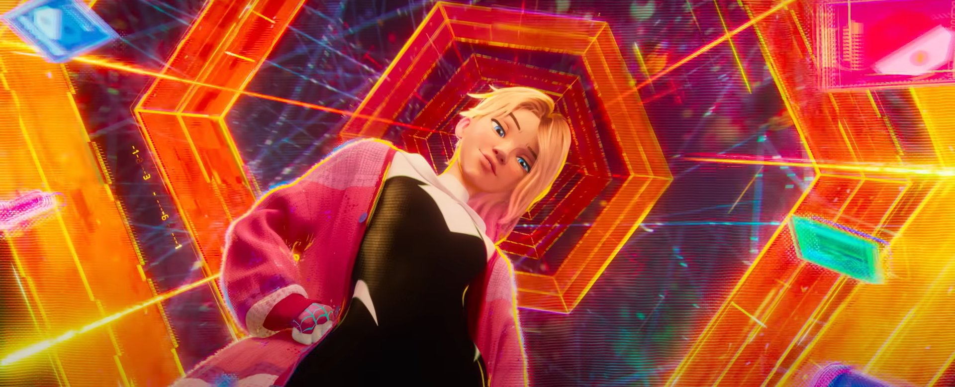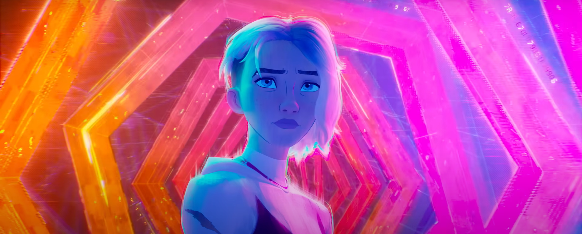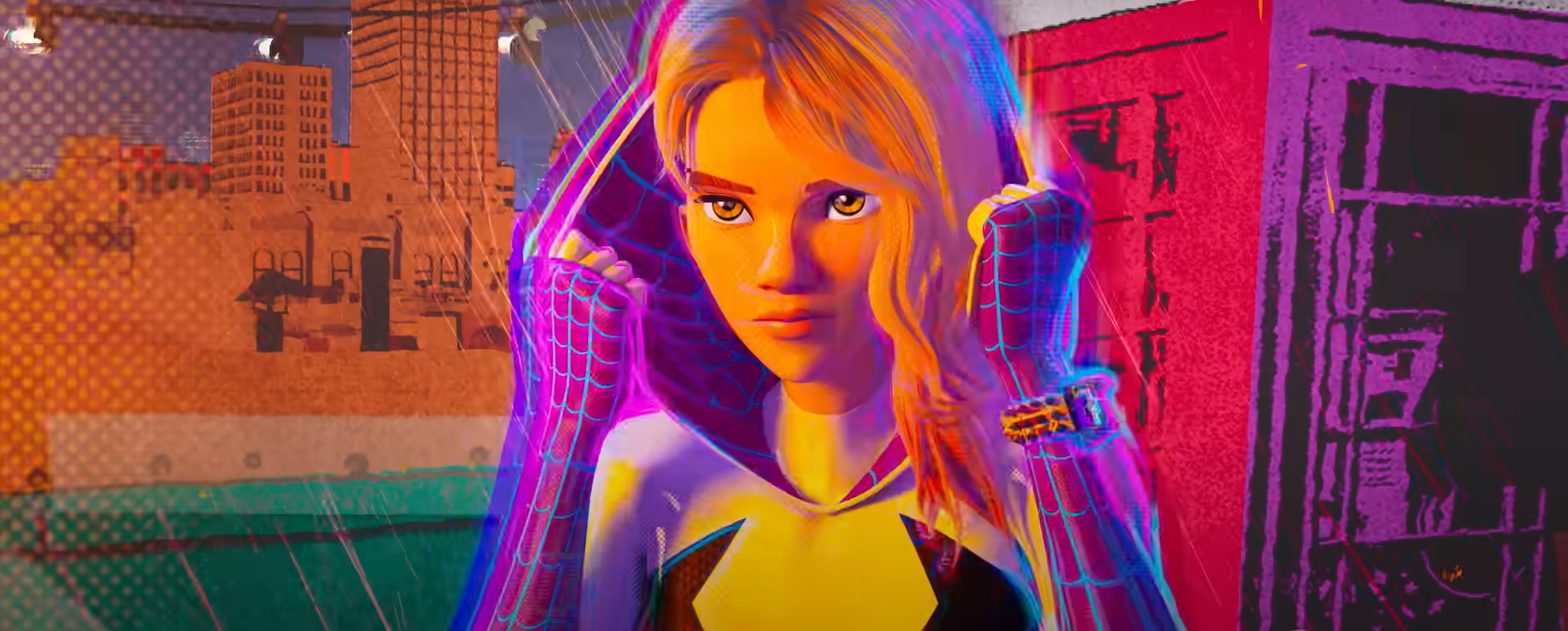 Après de nombreuses péripéties et la douloureuse mort de l’Oncle Aaron (le Rôdeur), Miles et les autres tisseurs ont enfin pu mettre un terme au plan du Caïd et sauver une première fois le multivers (en théorie). Voilà pour ce résumé de Spider-Man: Into the Spider-Verse, revenons maintenant à nos araignées. Dès le début du deuxième film, nous suivons les aventures de Gwen Stacy, alias Spider-Gwen, sur la Terre 66. En effet, Miles manque beaucoup à Gwen et elle doit également gérer sa double identité en tant que femme-araignée, ce qui est d’autant plus délicat étant donné que son père policier souhaite arrêter l’héroïne. Après un premier combat haut en couleurs, Gwen doit avouer la terrible vérité à son père, avant de s’enfuir avec d’autres Spider-Men rencontrés lors dudit combat.
