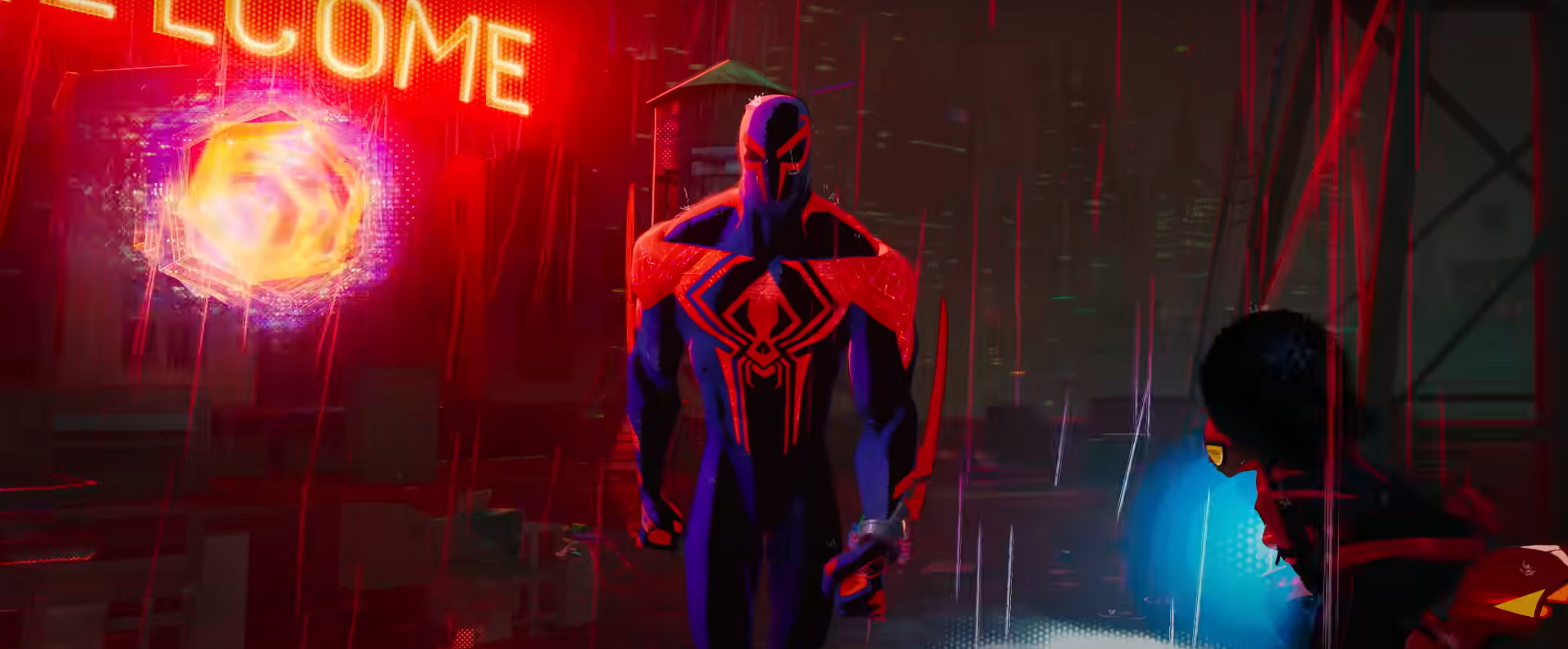 Nous redécouvrons alors un personnage déjà introduit dans l’univers de Gwen au début du film, personnage qui sera très important dans la suite de ce deuxième volet, à savoir Spider-Man 2099 (Terre 918), ou Miguel O’Hara pour les intimes. C’est ainsi qu’une lourde vérité est dévoilée concernant le Spider-Verse. En effet, dans le multivers connectant tous les Spider-Man, il existe des évènements Canevas. Ces évènements peuvent être bons comme mauvais, et relient tous les Spider-Men, formant alors des gigantesques toiles interconnectées. Vous l’aurez donc compris, mais tous les Spider-Men sont amenés à vivre de bons moments (mariages, rencontres, amour, enfants…) comme des évènements tragiques (morts d’amis, de membres de la famille…).