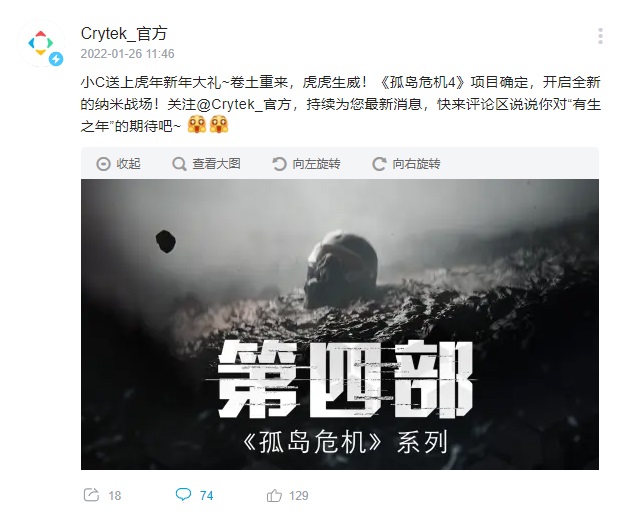 A coté de cela, le post écrit sur Bilibili annonce que « la firme Crytek dévoilera une surprise pour fêter l’année du Tigre qui commence le 1er février 2022″… Du coup, la surprise est un peu gâchée, car nous savons déjà le contenu de celle-ci…