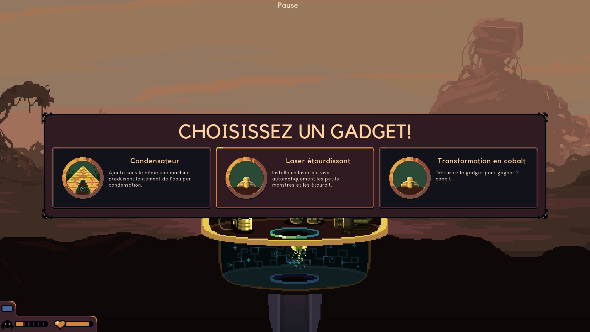 Ce qui marque de suite en découvrant Dome Keeper est sa réalisation. Les graphismes sont très beaux et la colorimétrie fait du bien à nos mirettes. Ensuite, le propos et le concept du jeu devraient nous maintenir en haleine un sacré bout de temps. Seul sur une planète à l’environnement hostile, notre garantie pour survivre sera de maintenir en bon état notre dôme. Pour ce faire, il faudra creuser et récolter de précieuses ressources dans les entrailles de la terre. Cependant, des monstres n’auront de cesse de s’attaquer à la structure nous permettant de respirer. Il s’agira alors de repousser ces assauts à l’aide de canons lasers, mitrailleuses et autres joyeusetés que nous aurons crafté au préalable. Vous l’aurez compris, il s’agira de rentabiliser notre temps entre deux attaques afin de se préparer correctement. Tout un programme.