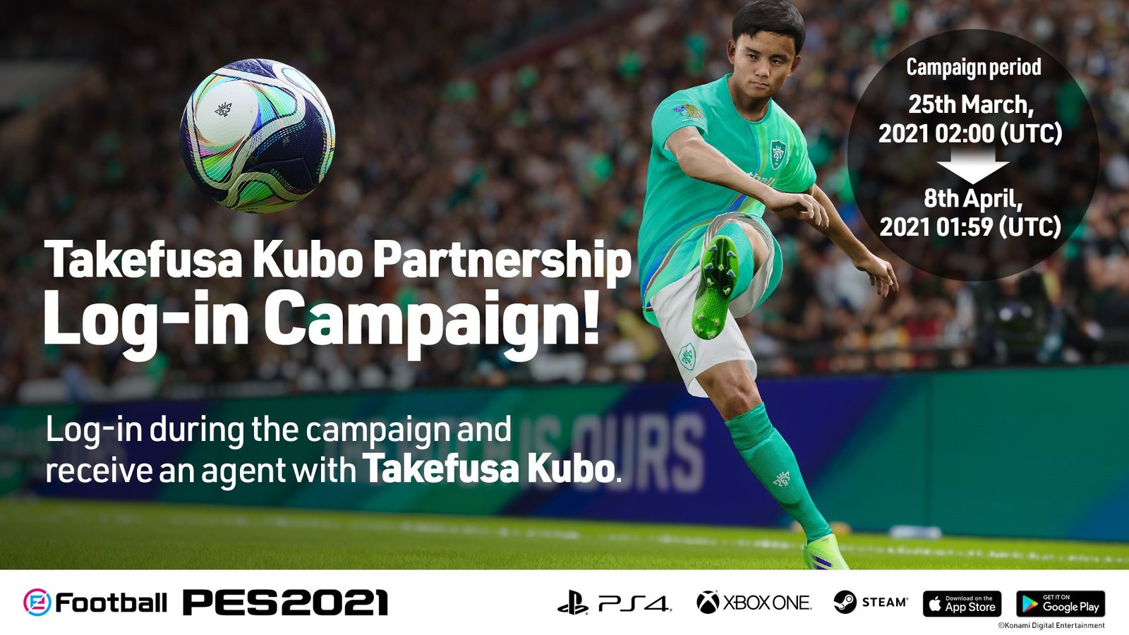 Âgé de 19 ans, le footballeur japonais a rapidement démontré ses talents et partage de nombreuses valeurs avec les autres footballeurs partenaires de KONAMI. L’entreprise souhaite soutenir Takefusa Kubo, et d’autres jeunes joueurs comme lui, pour voir sa carrière se développer et atteindre de nouveaux sommets. Pour célébrer ce partenariat, KONAMI va lancer plusieurs campagnes eFootball PES 2021 en jeu, dont une campagne de connexion pour remporter son « Joueur en vue », ainsi qu’une campagne #VamosTAKE sur les réseaux sociaux.