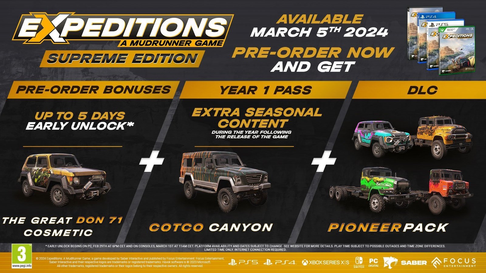 Expeditions : A MudRunner Game est le prochain jeu du côté du développeur Saber Interactive. Édité par Focus Entertainment, Expeditions : A MudRunner Game sortira le 5 mars prochain sur PlayStation 5, PlayStation 4, Xbox One, Xbox Series X|S, Nintendo Switch et PC.