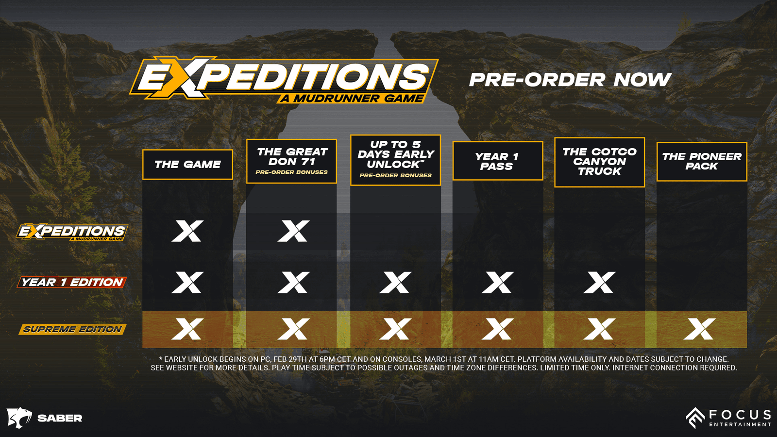 Au sein du jeu Expeditions : A MudRunner Game, l’exploration sera le point central de votre aventure. Découvrez de nombreuses étendues sauvages, au sein de déserts arides, ou encore, des forêts accidentées. Vous allez devoir effectuer diverses missions de recherche au sein de la nature. Pour cela, vous disposerez de nombreux outils et gadgets ainsi que divers véhicules, qu’il sera possible d’équiper de scanner. Pour le bien de vos différentes expéditions, vous allez pouvoir construire une base, qui servira de repaire central pour préparer au mieux vos différentes expéditions. Il sera possible de jouer au jeu, 4 ou 5 jours avant la sortie officielle en vous procurant l’Édition Supreme, ou l’Édition Year 1 pour obtenir le Year Pass, du contenu exclusif et l’accès au jeu en Early Unlock.