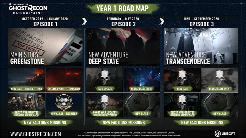 Dès le lancement de Ghost Recon Breakpoint, l’Année 1 pointera bout de son agenda. Quant à l’ajout des épisodes ils se feront à intervalle de 4 mois. dont voici la liste de la feuille de route.