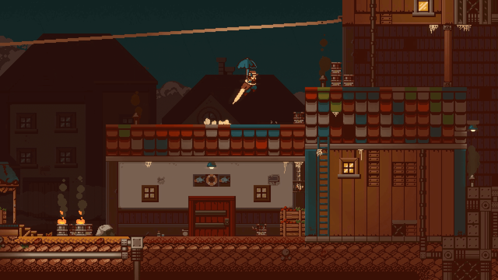 Avec son scrolling horizontal, Gunbrella est un jeu d’action et d’aventure sombre. Vous évoluerez dans un monde dont la ressource naturelle principale diminue dangereusement. Incarnez un bûcheron bourru armé d’un parapluie original dans une quête rocambolesque visant à rétablir l’équilibre. Une histoire de vengeance, en somme. Alors que vous débarquez dans une ville hostile, simplement équipé de votre « Gunbrella », vous voilà catapulté dans une enquête musclée pour démêler une cabale fomentée par des goules, des gangsters, des flics et autres gourous, sur fond d’incurie industrielle. Votre pétoire de gros calibre, camouflée dans un parapluie, ne sera vraiment pas de trop.