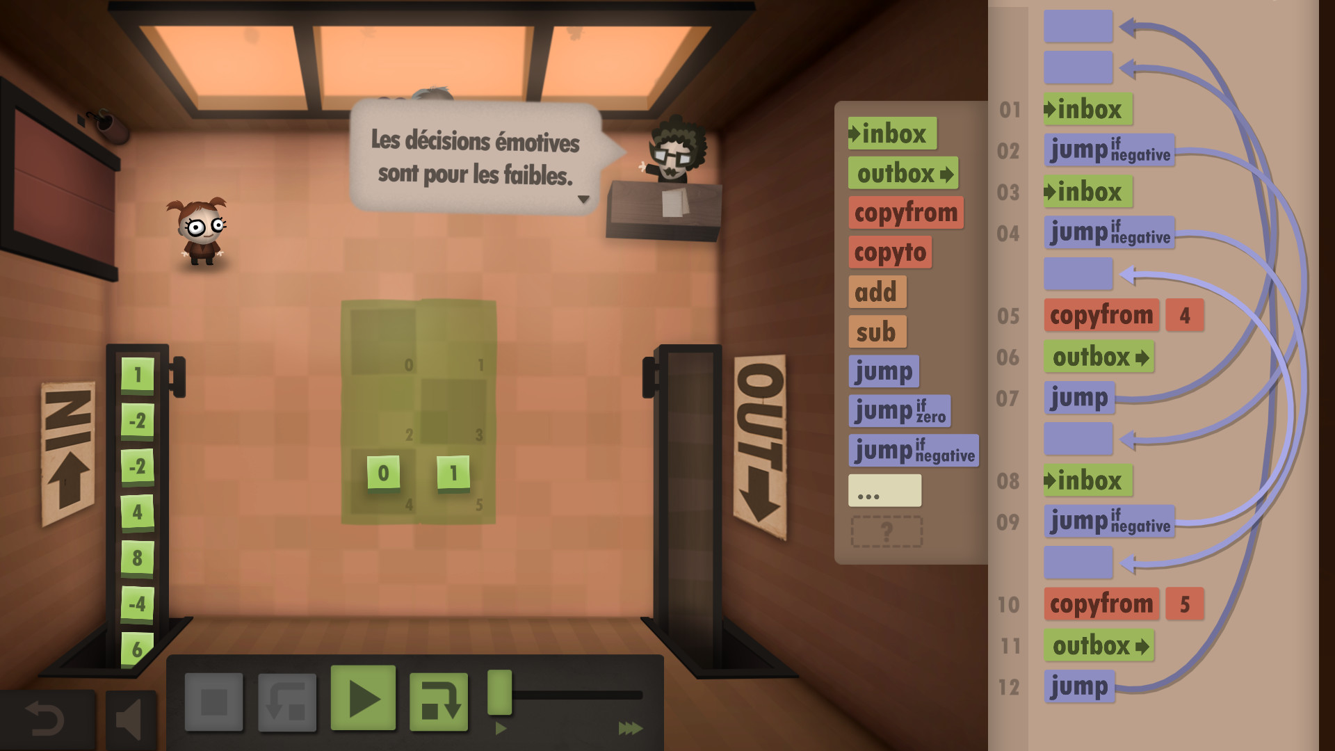 « Human Resource Machine est un jeu d’énigmes pour geeks. Dans chaque niveau, votre patron vous donne un travail. Automatisez-le en programmant votre petit employé de bureau. Si vous réussissez, vous serez promu au niveau suivant et travaillerez un an de plus dans l’immense entreprise. »