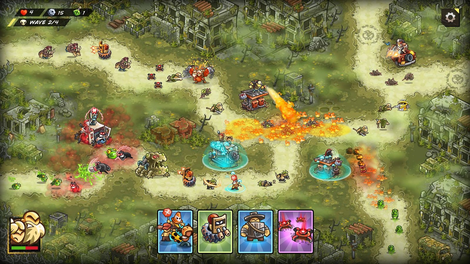 - Le jeu propose 16 tours aux effets variés. Certaines sont dotées de foreuses hydrauliques, d’autres de taureaux mécaniques, d’autres encore peuvent transformer les ennemis en moutons.