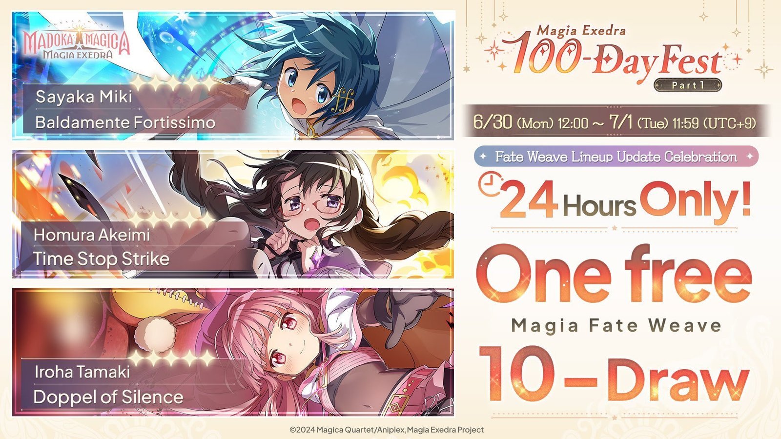 Pour célébrer les 100 jours de Puella Magi Madoka Magica: Magia Exedra, Aniplex lance un événement exceptionnel, riche en bonus et en invocations gratuites. Les fans de RPG et de magical girls vont être comblés ! Pendant une durée limitée, le jeu propose une série de campagnes exclusives. Cette séries de campagnes, sera l’occasion d’obtenir des récompenses généreuses, ainsi que de nouvelles unités 5★ Kioku ou encore, une pluie de Magica Stones à collecter.