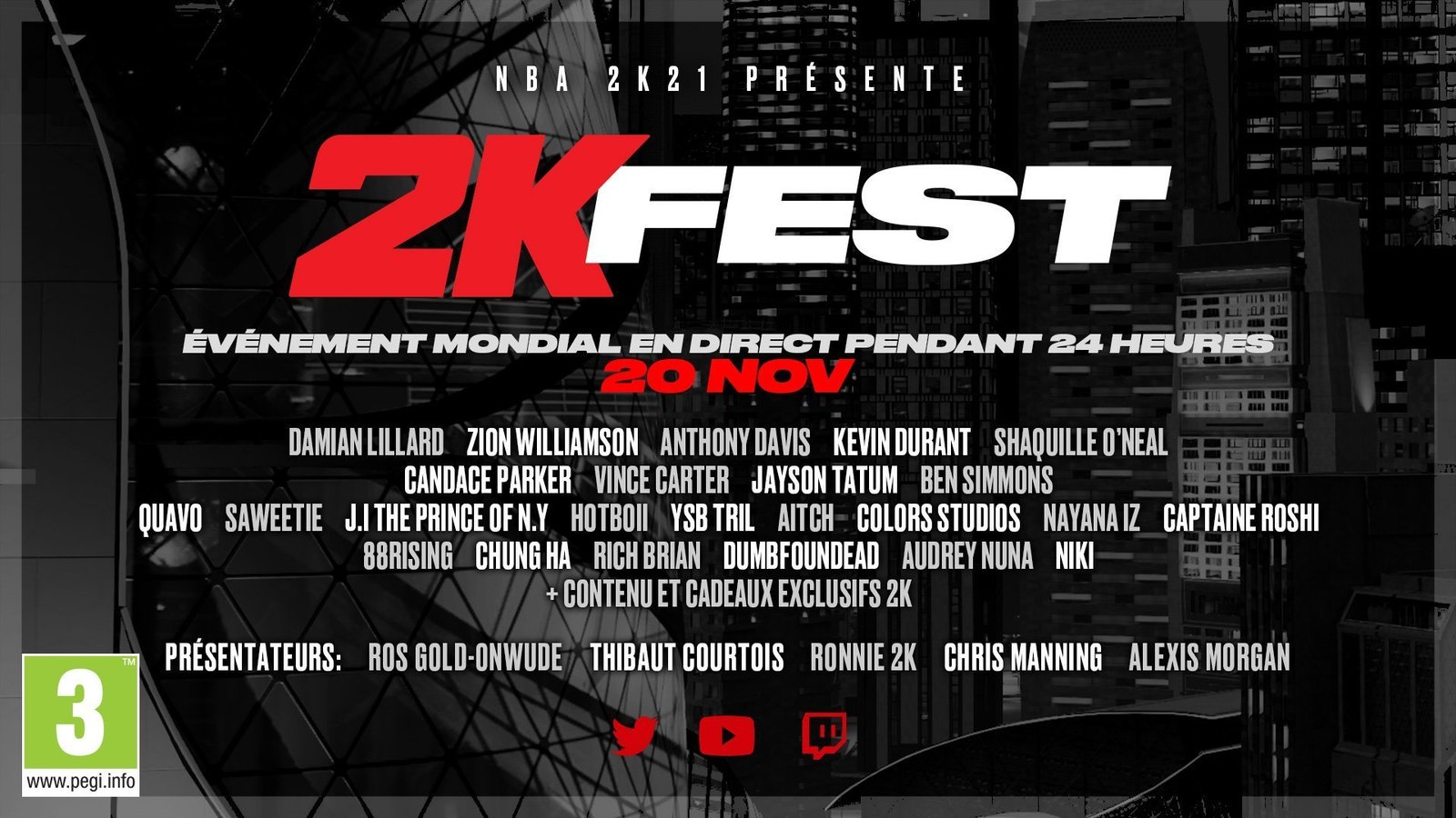 Le 2KFest se déroulera du vendredi 20 novembre de 9h00 au samedi 21 novembre 9h00 et pourra être suivi en direct sur Twitter, avec des livestreams additionnels sur YouTube et Twitch. Les fans peuvent rejoindre la conversation en utilisant le hashtag #2KFest.