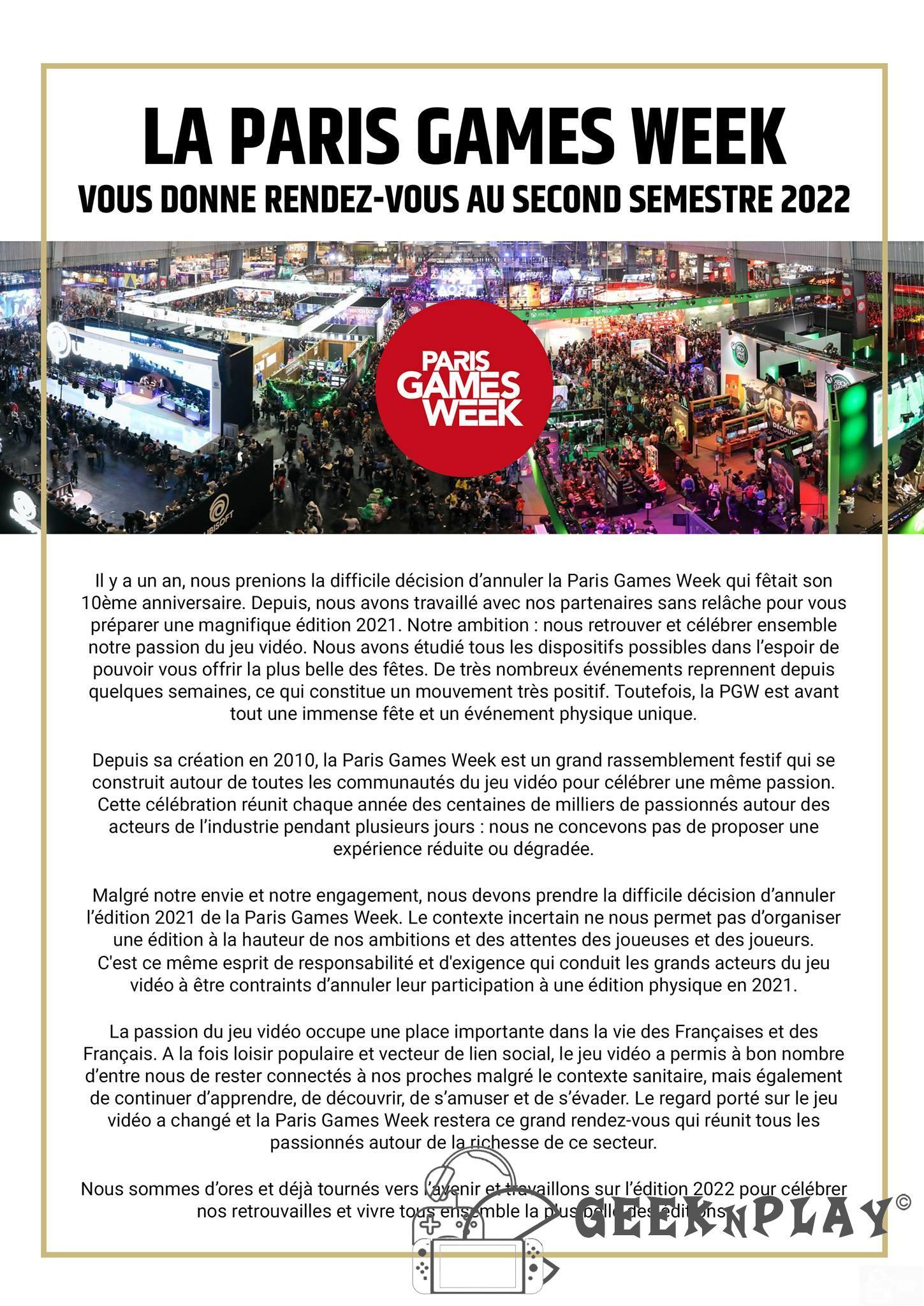 Comme vous pouvez le constater, la fin du message est plus sympathique et vise un futur proche pour un Paris Game Week 2022 qui devrait permettre de se retrouver…Chez GeekNPlay, on l’espère car la Covid-19 perturbe les différents salons dans le monde et que les festivités liées autour des jeux vidéo nous manquent.
