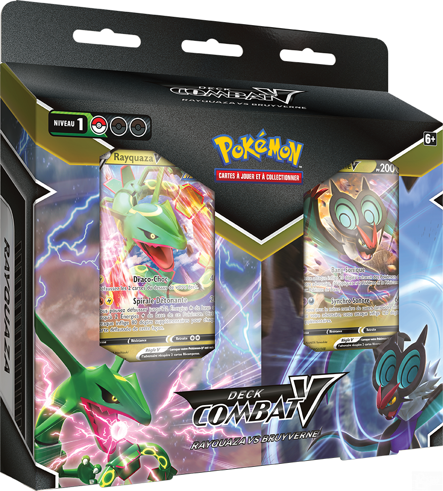« Les Dresseurs pourront aussi se procurer les nouveaux Decks Combat-V mettant à l’honneur Rayquaza-V et Bruyverne-V, un moyen facile et amusant d’apprendre à jouer au JCC Pokémon. Chaque Deck Combat-V contient tout ce dont vous avez besoin pour jouer au JCC Pokémon, dont un deck de 60 cartes, des guides pour apprendre à jouer et des accessoires. Le lot Deck Combat-V – Rayquaza vs Bruyverne est également disponible, il contient deux decks prêts à jouer, des accessoires et 8 cartes Dresseur supplémentaires. »