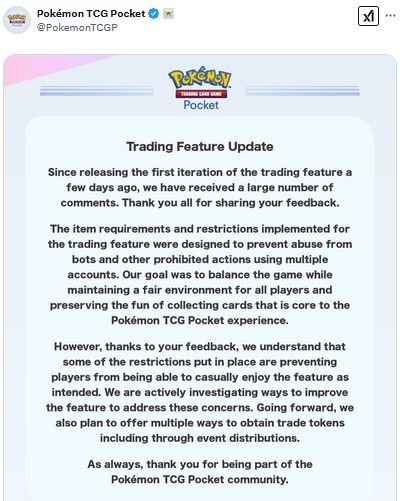 Les joueurs ont eu le droit à un communiqué officiel, par le biais du réseau social X. Nous apprenons que le système d’échange, fut conçu pour éviter les comptes bots de certains utilisateurs. Cependant, les développeurs travaillent actuellement sur une solution pour la communauté, pour simplifier l’obtention de jetons d’échange. Cela pourrait se faire, par le biais des récompenses d’événements notamment. Difficile de savoir si des changements seront visibles rapidement au sein de Pokémon TCG Pocket, mais nous espérons une mise à jour très rapide pour le bien de la communauté.