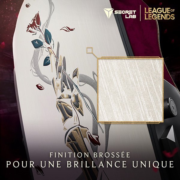La chaise Jhin Edition est revêtue d’un somptueux similicuir blanc Secretlab NEO, spécialement conçu pour cette édition. Son fini brossé et sa brillance distinctive évoquent les plis de la cape de Jhin, ajoutant une touche d’élégance unique à la chaise. Chaque détail de l’ornementation du démon doré est magnifiquement reflété, créant ainsi une pièce d’exception pour les fans de League of Legends. Elle évoque avec élégance l’attention méticuleuse que Jhin porte aux détails dans chacune de ses démonstrations théâtrales et tortueuses. Avec son superbe revêtement en daim, ses ailes grises et les accents dorés, elle reflète parfaitement le style unique du démon doré. Le masque emblématique de Jhin est également sublimement cousu sur le dossier de la chaise, dans différentes nuances d’ivoire, ajoutant ainsi une touche distinctive et raffinée à cet accessoire remarquable.