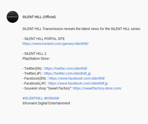 Cela n’est plus un secret pour personne, mais tout va très vite sur Internet et la moindre erreur peut ruiner beaucoup d’efforts de préparation. Alors que Konami avait littéralement hypé les joueurs en nous donnant rendez-vous pour une Silent Hill Transmission, afin de nous dévoiler le futur de la célèbre franchise horrifique, l’effet de surprise a peut-être été gâché. En effet, Konami a fait les préparatifs pour le live à venir. Néanmoins, tout ne s’est pas passé comme prévu et des informations à priori primordiales pour ladite transmission ont été parsemées dans la description du live ainsi que dans les tags de la vidéo YouTube.