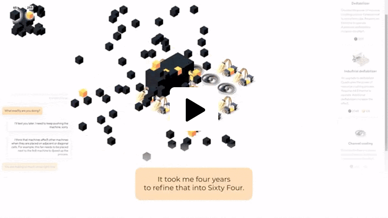 Transformez de simples machines en une usine florissante dans un univers minimaliste extraordinaire. Commencez votre périple avec une simple machine produisant des cubes distincts. Utilisez des combinaisons de cubes pour débloquer des machines avancées et de nouveaux aspects de gameplay. Adaptez vos tactiques aux évolutions du terrain et aux types d’ennemis. Votre usine n’est pas simplement un amas de machines inertes ; elle constitue un environnement dynamique de défis et de stratégie. Faites face à de nouvelles situations et découvrez des opportunités avec chaque machine innovante et abstraite que vous rencontrez. Sixty Four combine des éléments simples mais engageants issus des jeux de clics, d’incrémentation et de stratégie. Poursuivez une amélioration constante et dévoilez les secrets derrière les messages d’une entité inconnue.