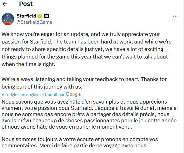 Pour notre plus grand plaisir, Bethesda décide de répondre à cette personne sur le réseau social X, en indiquant, que beaucoup de choses sont prévues pour cette année, mais qu’ils ne peuvent pas en parler pour le moment. Il insiste également, sur le fait qu’ils écoutent avec une grande importance, la communauté du jeu, pour pouvoir fournir notamment, du contenu de qualité. C’est une excellente nouvelle pour les joueurs de Starfield !