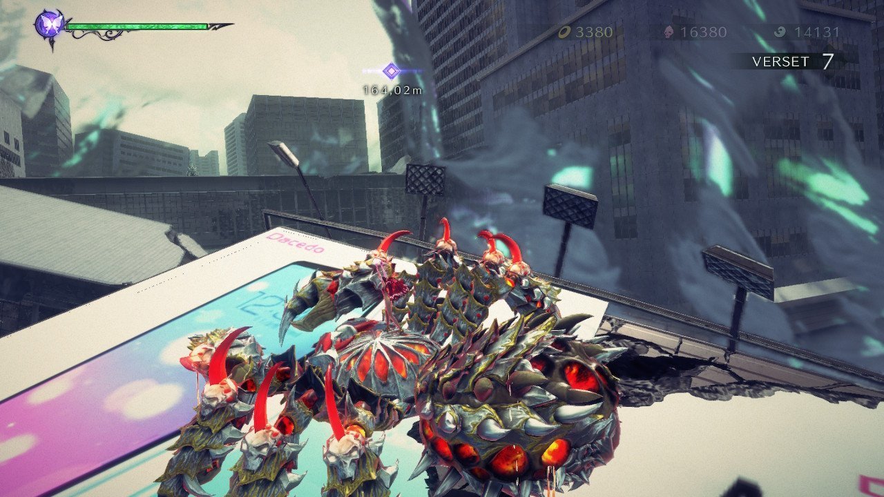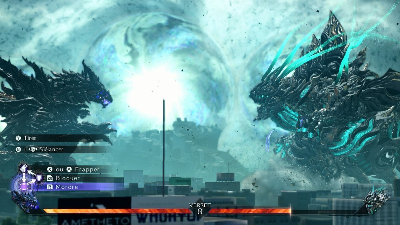 Vous l’avez compris, l’action est omniprésente dans Bayonetta 3. Le titre vous permet même parfois de contrôler vos démons dans des phases « wtf ». Par exemple, Gomorah n’hésitera pas à sauter sur 4 ferries pour s’en servir comme … jet ski ?! Vous devrez alors le guider pour qu’il évite de se prendre les piliers des ponts et autres immeubles. Il faut le voir pour le croire. De même, certaines scènes s’apparentent à du shoot em up en vue à la première personne comme ce passage où l’on contrôle un train, à la troisième personne comme dans Panzer Dragoon ou tout simplement à l’ancienne en 2.5D. Des petites phases courtes et agréables qui coupent la monotonie qui pouvait s’installer. Il vous arrivera même de contrôler certains de vos démons dans leur version « max ». Dès lors, les batailles avec Gomorah peuvent faire penser aux films de monstres japonais mettant en scène Godzilla ou plus récemment, à Pacific Rim de Guillermo Del Toro. Vu de profil, vous allez devoir choisir vos attaques selon une logique à la pierre/feuille/ciseau pour vaincre votre adversaire. Certes, dans ces moments, le titre souffre d’une certaine lourdeur, mais l’expérience est spectaculaire et jouissive. Nous vous laissons découvrir l’apparition de la Reine Butterfly ou la séquence avec BAAL ZEBUL. En tout cas, l’utilisation des QTE a été abandonnée. Seuls les coups finaux qui consistent à marteler un bouton ou à effectuer des rotations ont été gardés.