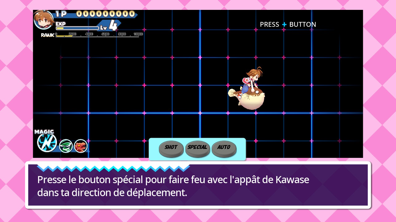 - Kawase et son poisson globe propose un tir qui change en fonction de la couleur du cristal que vous récupérer. Vous n’aurez pas de coups spéciaux mais votre compagnon pourra gober les ennemis et les recracher.