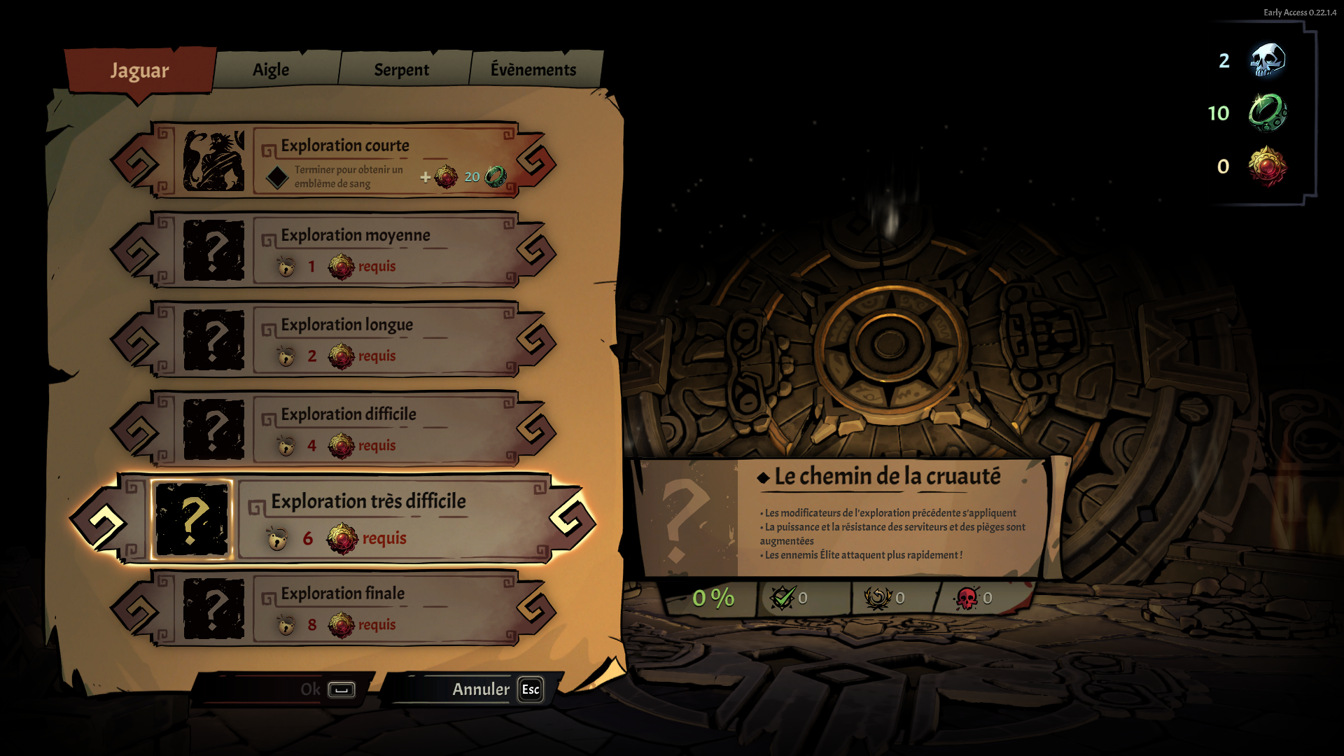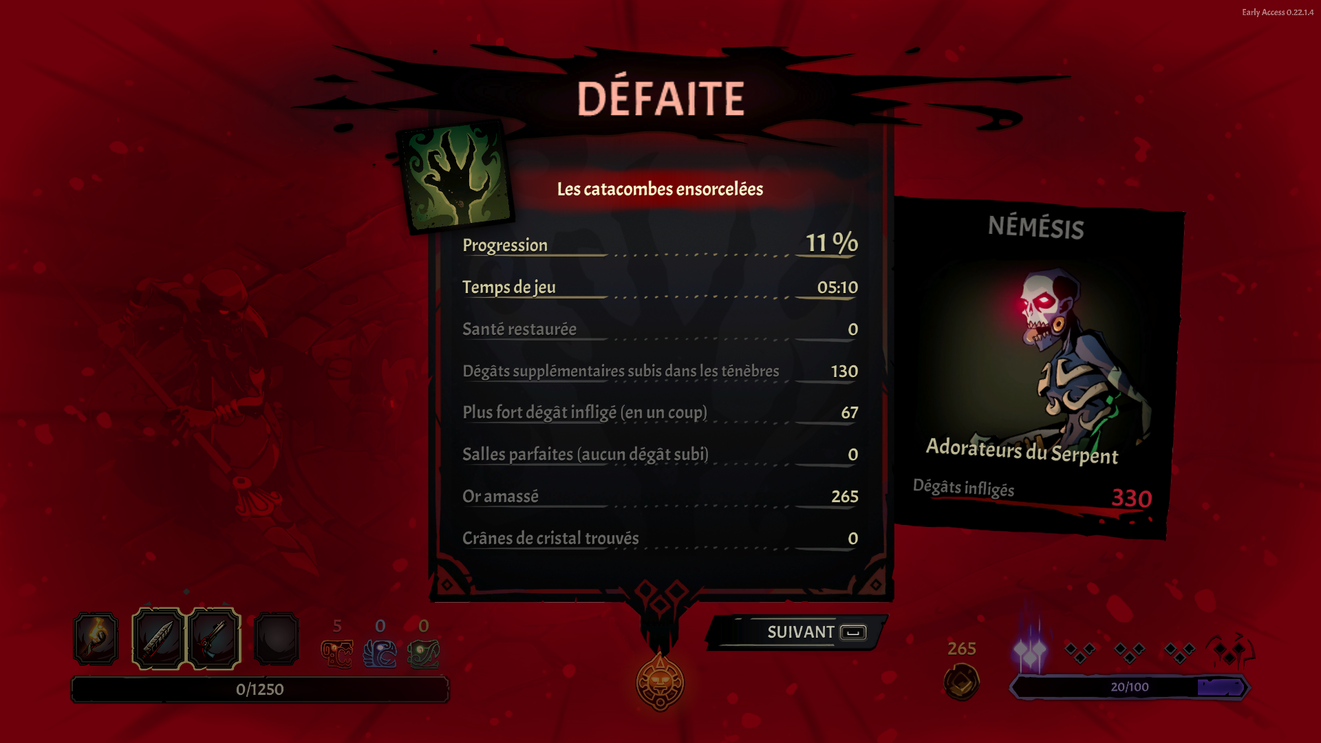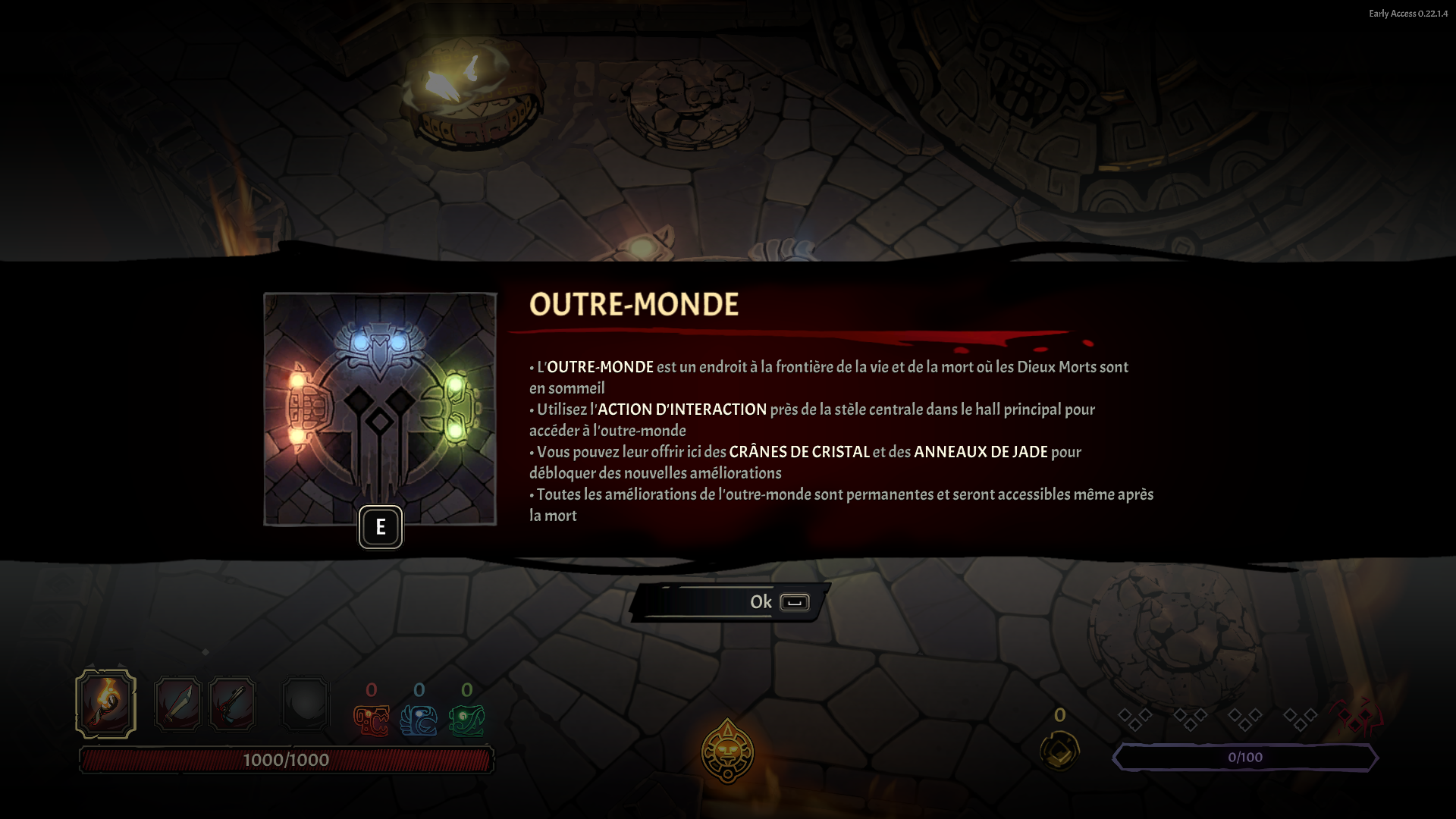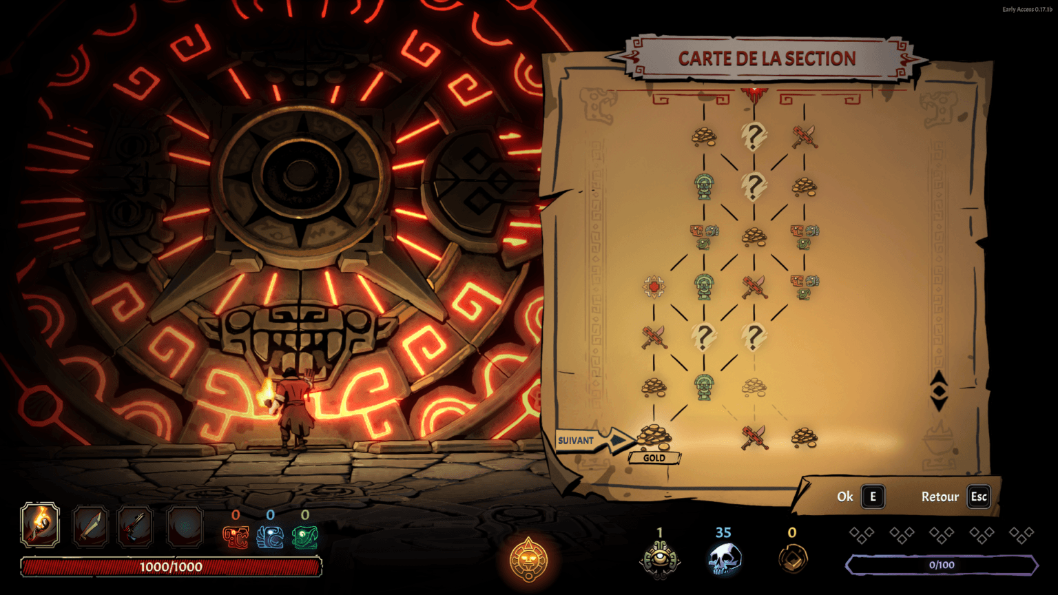 Dans ce genre de jeu, il est assez courant de mourir. Lorsque nous tombons sous les coups de monstres adverses, nous arrivons dans l’outre-monde. Cet endroit à la frontière entre le monde des morts et celui des vivants est le point de départ de chaque aventure.  Mais bien évidemment, chaque mort à ses conséquences. Si nous arrivons dans l’outre-monde nous perdons notre stuff accumulé lors de la dernière partie non finie. Mais nous conservons les crânes de nos ennemis. Un peu glauque si vous voulez mon avis mais bon il faut bien XP un peu. Avec ces crânes on peut débloquer des bénédictions spéciales qui nous aideront à finir chaque temple plus aisément.