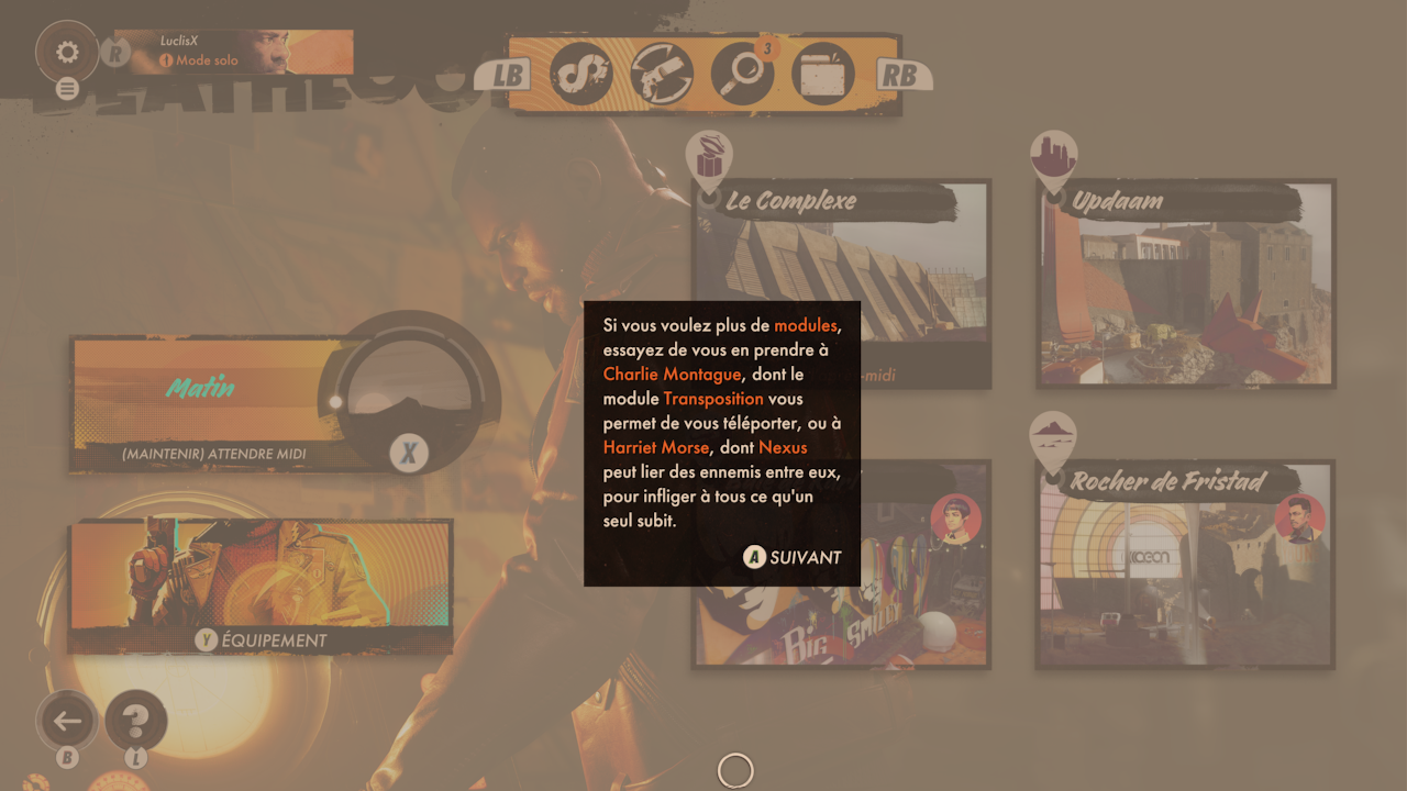 Car comme on l’a dit, DeathLoop intègre un côté Roguelike. Celui-ci se retrouve dans le fonctionnement des boucles, dont on parlera un peu plus tard. Le principe est simple : à chaque mort, vous recommencez la boucle. À chaque fin de journée … Vous recommencez la boucle. Et ce jusqu’à ce que vous débloquiez la condition suprême et finissez le jeu. Autant dire qu’il vous faudra résoudre une espèce d’énigme sur un fond de Die & Retry, et cela plusieurs fois avant d’arriver réellement au bout de l’aventure. Ah, est-ce qu’on vous a dit que vous perdiez tout lorsque vous recommencez une journée ?