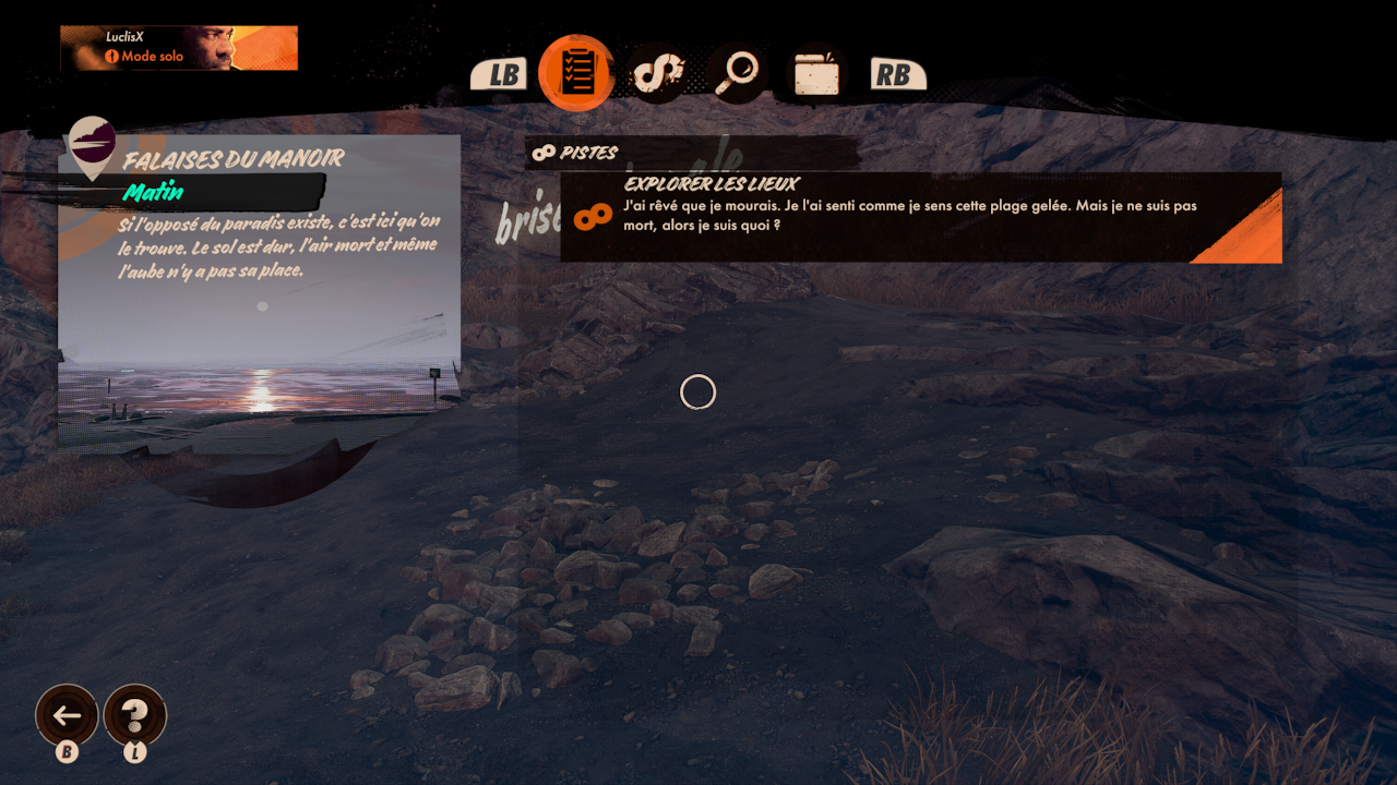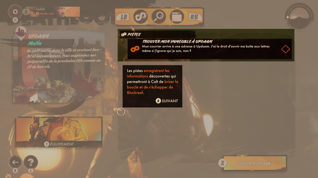 Il y a en tout 4 terrains Updaam, le Rocher de Fristad, le Complexe et la Baie de Karl. Et chaque journée est divisée en 4 parties : le matin, midi, l’après-midi, et le soir. Comme chacune d’entre elles change, vous allez pouvoir profiter de 16 cartes différentes malgré une trame similaire. Il faudra donc osciller entre l’ensemble des cartes, l’ensemble des parties de la journée jusqu’à obtenir la piste qui vous permettra la victoire. Mais en cours de route, il sera également bon de faire quelques missions d’armes. Le jeu dénombre 4 armes qui changent réellement le cours de vos parties. Celles-ci vous seront donc à quasi coup sûr nécessaires … Mais n’oubliez pas que toutes les nuits, vous perdez l’ensemble de votre équipement … C’est tout du moins le cas tant que vous n’avez pas fait la quête « Ubiquité ». Celle-ci vous permettra de conserver votre meilleur équipement.