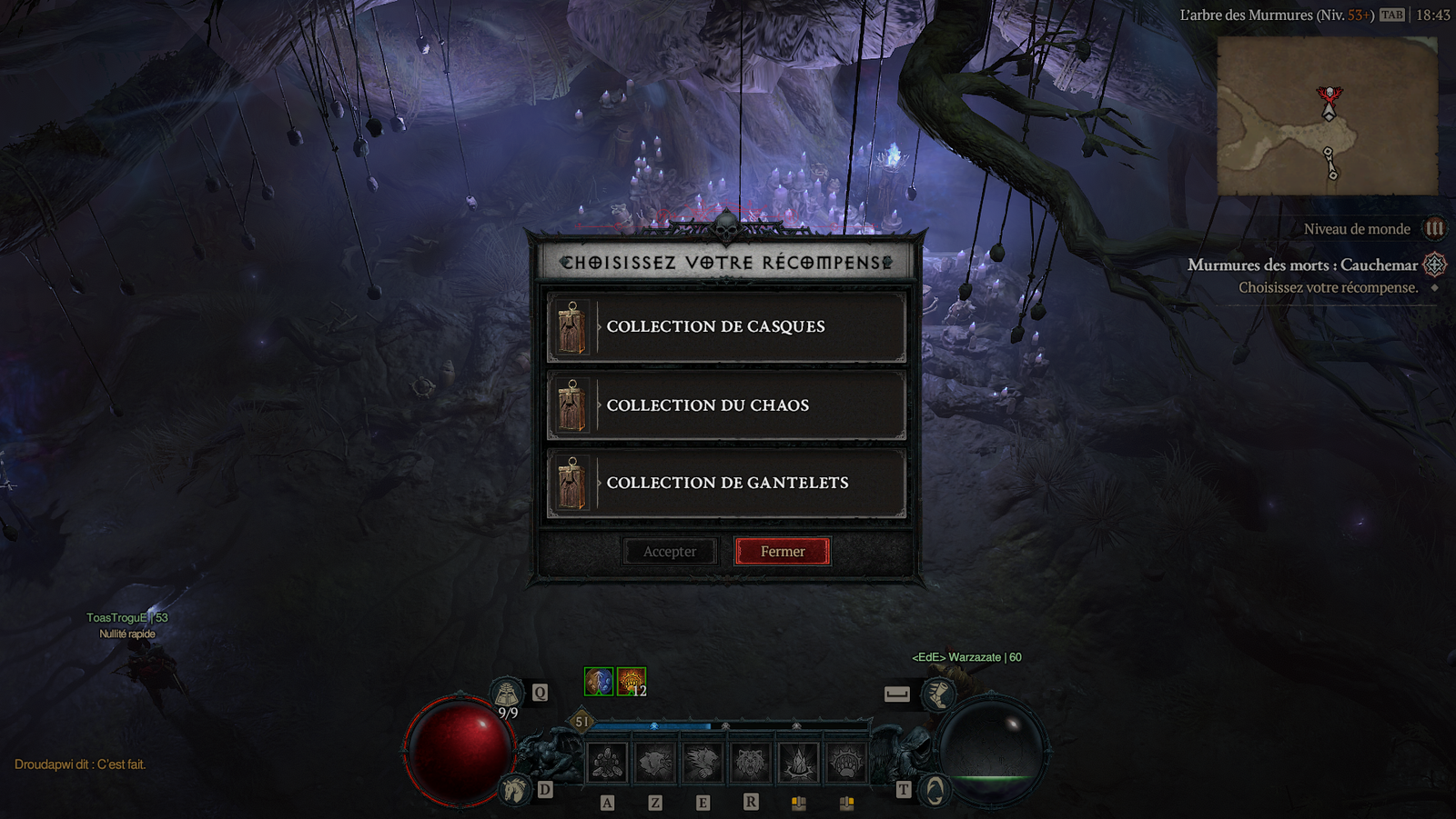 Parlons un peu plus gameplay à présent. Tout commence avec le choix de votre classe. Comme dans tout bon hack&slash vous avez le choix entre plusieurs classes qui sont : Voleur, Barbare, Necromancien, Sorcier et Druide. Ce choix se fait selon le type de gameplay qui vous intéressera le plus. On peut vous conseiller les tester si vous êtes débutants ou regarder des vidéos guides par classe pour faire une idée de leur gameplay. Certaines classes vont se jouer plus à distance (Sorcier, Voleur), d’autre de manière plus bourrine en corps-à-corps (Barbare). Le nécromancien et Druide de leur côté peuvent se jouer à votre guise selon le build que vous allez suivre. Nous parlons plus tard de l’arbre de compétences dans Diablo IV.