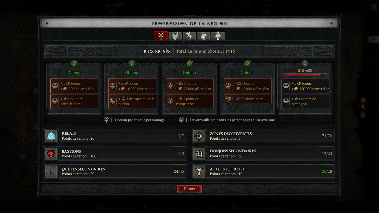 Un autre aspect assez important dans votre progression dans Diablo IV va être d’améliorer votre renommée. Ce système est une sorte d’encouragement à découvrir tous les recoins de la map. Vous allez comprendre pourquoi. Afin d’obtenir les nombreux bonus que peuvent vous apporter cette renommée, vous devrez remplir 5 niveaux par région. Réussir à finir tous les niveaux de toutes les régions représente presque à faire 100% du jeu.