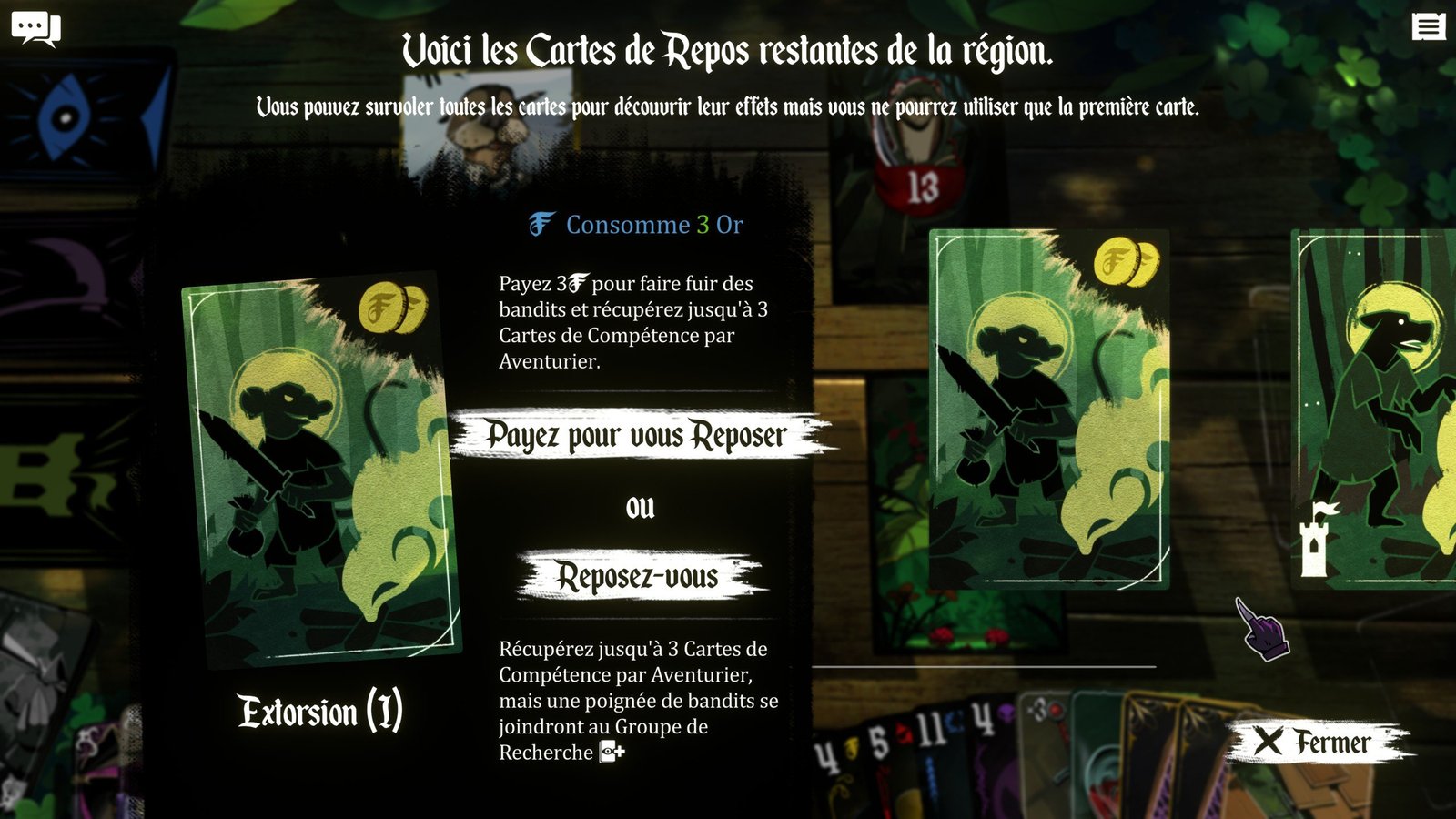 Intéressons-nous justement à ce second type de cartes présent dans nos mains, qui se révèle fort utile et très plaisant à manipuler de part sa versatilité. En effet, les ressources sont nombreuses et possèdent des usages différents qui, bien qu’ils demeurent logiques, peuvent altérer grandement votre mission. Commençons donc avec l’or, qui permet bien évidemment de commercer, mais aussi de soudoyer. Cela sera bien utile pour échapper à certains combats contre des gardes à la moralité douteuse ou des bandits aux poches trouées. Ensuite, vient la nourriture, qui permet principalement de se soigner. Il est toujours rassurant d’avoir quelques unités dans nos poches, afin de parer à toute conséquence malheureuse de nos actions. De plus, certains personnages tels que les mendiants par exemple, seront à même de délivrer de bonnes informations une fois le ventre rempli.
