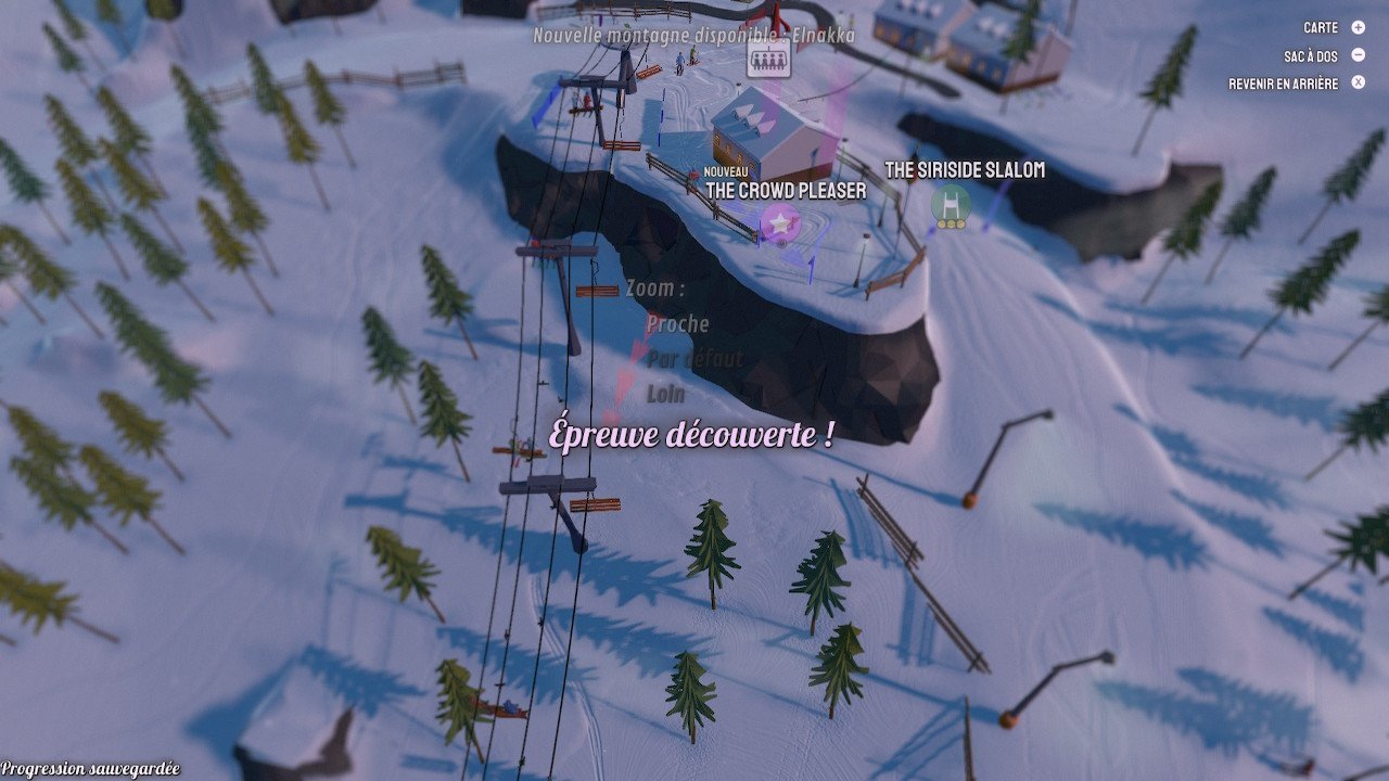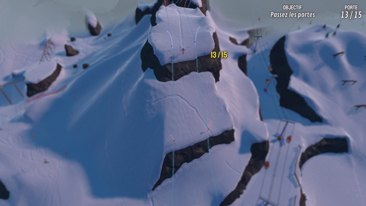 Au début de l’aventure, c’est assez simple, on dirige notre skieur ou notre snowboardeur que l’on peut changer à la volée et l’on descend des pistes assez faciles avec des portes de couleur rouge ou bleu à franchir. Une fois quelques pistes descendues, vous gagnez des forfaits, vous permettant de déverrouiller les télésièges et de découvrir de nouvelles zones, ainsi que de nouvelles épreuves, comme la possibilité d’effectuer un saut en longueur, ou encore d’atteindre une certaine zone en un temps précis.