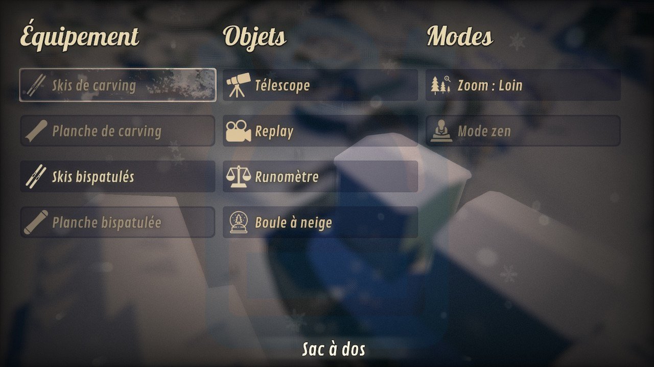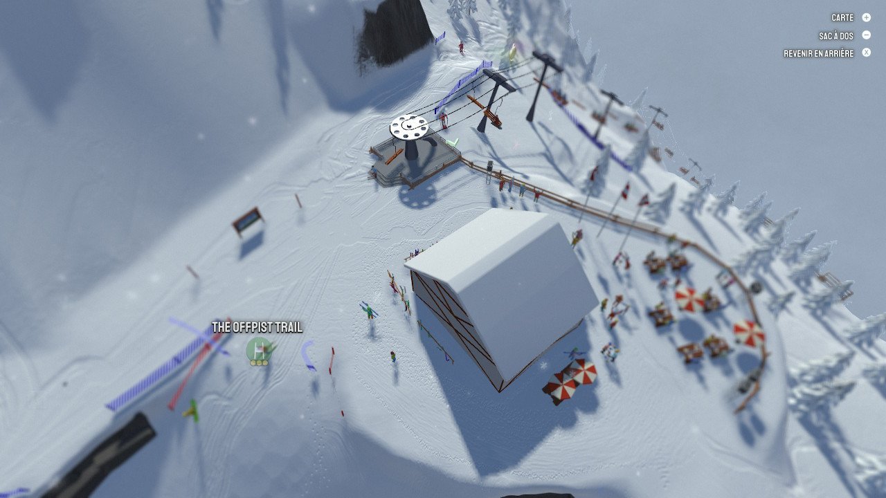 Que propose le jeu ? Et bien la possibilité de chausser vos skis ou vos snowboards et d’explorer 12 stations de sports d’hiver façon open-world. Si cela parait réjouissant, on s’aperçoit assez vite que vous ne disposerez que d’une vue isométrique …En clair, vous verrez votre personnage avec une vue du dessus, et vous ne pourrez jamais vraiment explorer les graphismes ou les pistes du jeu…Mais ce n’est pas trop grave dans les faits, car les graphismes sont minimalistes et l’on se perd parfois dans les décors.