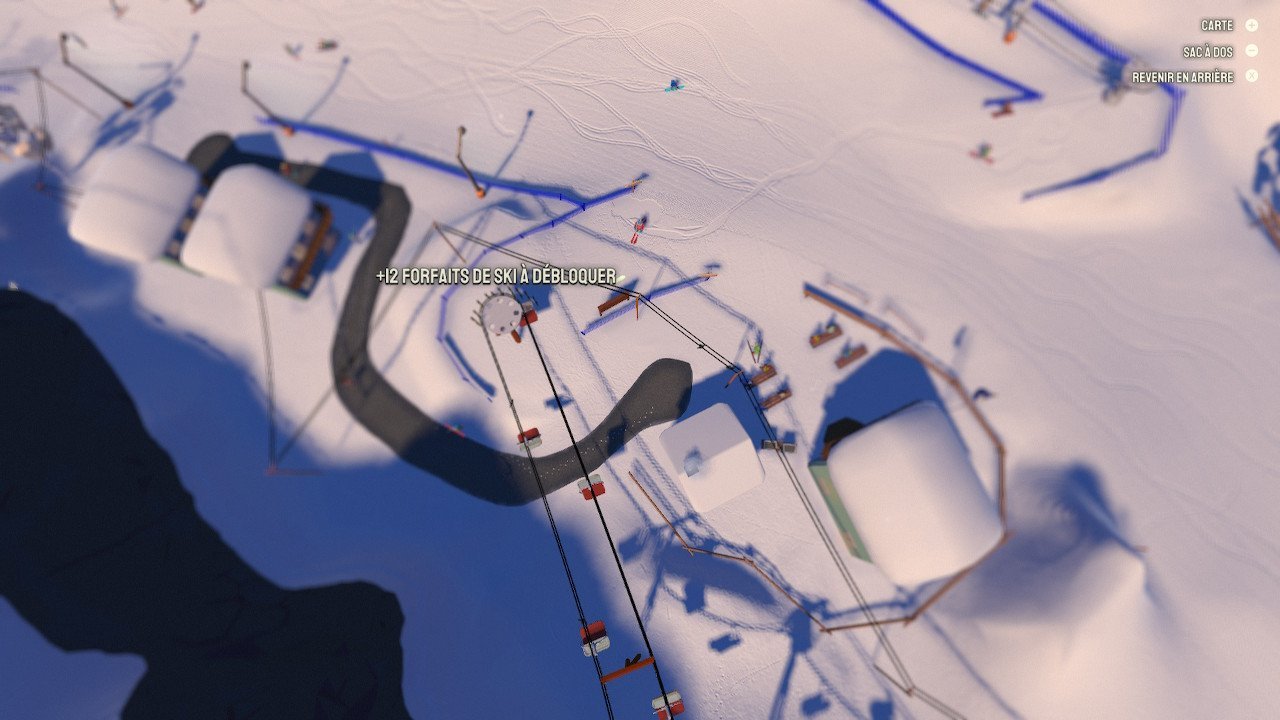 Au début de l’aventure, c’est assez simple, on dirige notre skieur ou notre snowboardeur que l’on peut changer à la volée et l’on descend des pistes assez faciles avec des portes de couleur rouge ou bleu à franchir. Une fois quelques pistes descendues, vous gagnez des forfaits, vous permettant de déverrouiller les télésièges et de découvrir de nouvelles zones, ainsi que de nouvelles épreuves, comme la possibilité d’effectuer un saut en longueur, ou encore d’atteindre une certaine zone en un temps précis.