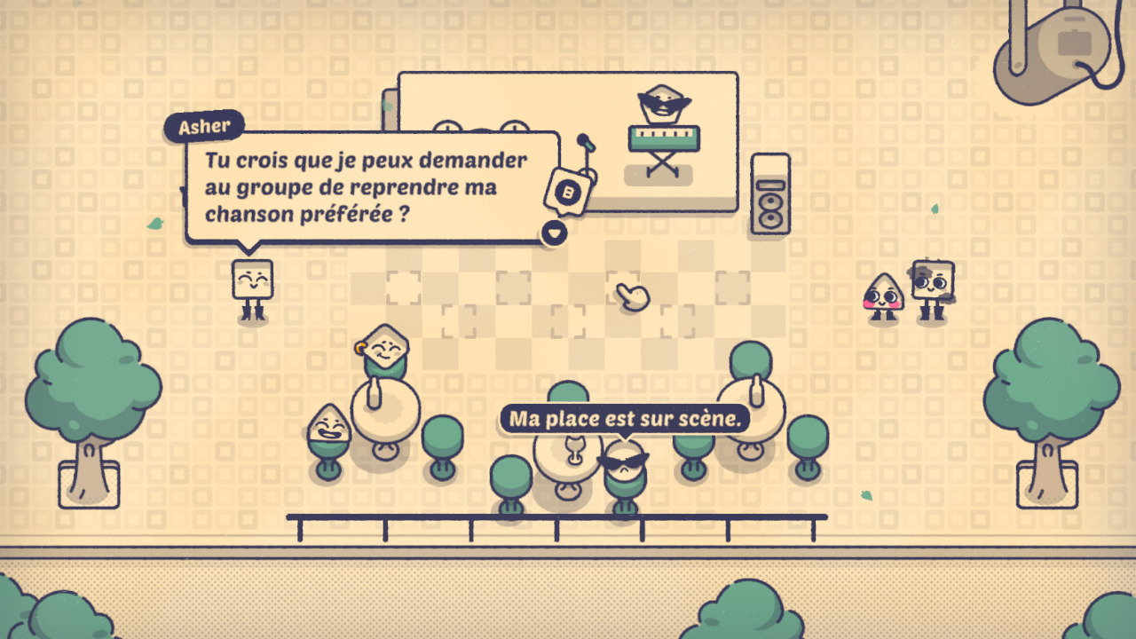 La direction artistique de Is This Seat Taken? est assez particulière et mérite qu’on s’y attarde. Très agréable à l’œil grâce aux différentes couleurs, elle mise sur une grande simplicité, que ce soit pour les personnages, les objets ou l’environnement. Un choix minimaliste mais malin, car il rend l’action claire et lisible, un indispensable pour un puzzle game ! Les petites animations d’expressions sont un vrai plus : on comprend d’un coup d’œil quand une forme n’est pas satisfaite (comme « ça cocotte grave », l’expression associé à une forme qui râle parce qu’elle est assise à côté d’une autre dont elle ne supporte pas l’odeur). Rien de tape-à-l’œil, mais une approche légère et amusante qui colle parfaitement à l’ambiance du titre. On sent que le studio a préféré miser sur l’efficacité et la lisibilité plutôt que sur la surenchère visuelle, et franchement, ça marche !