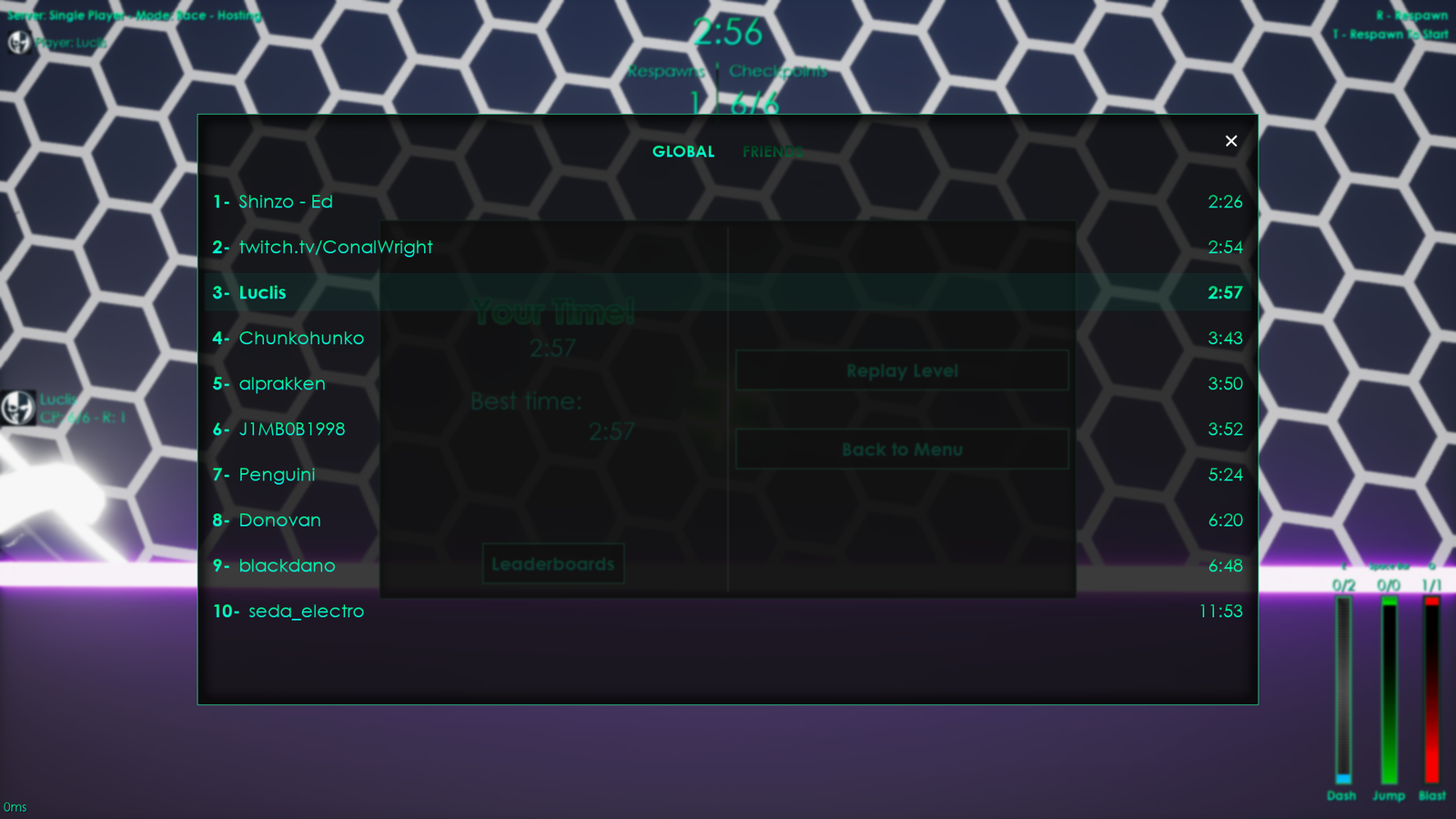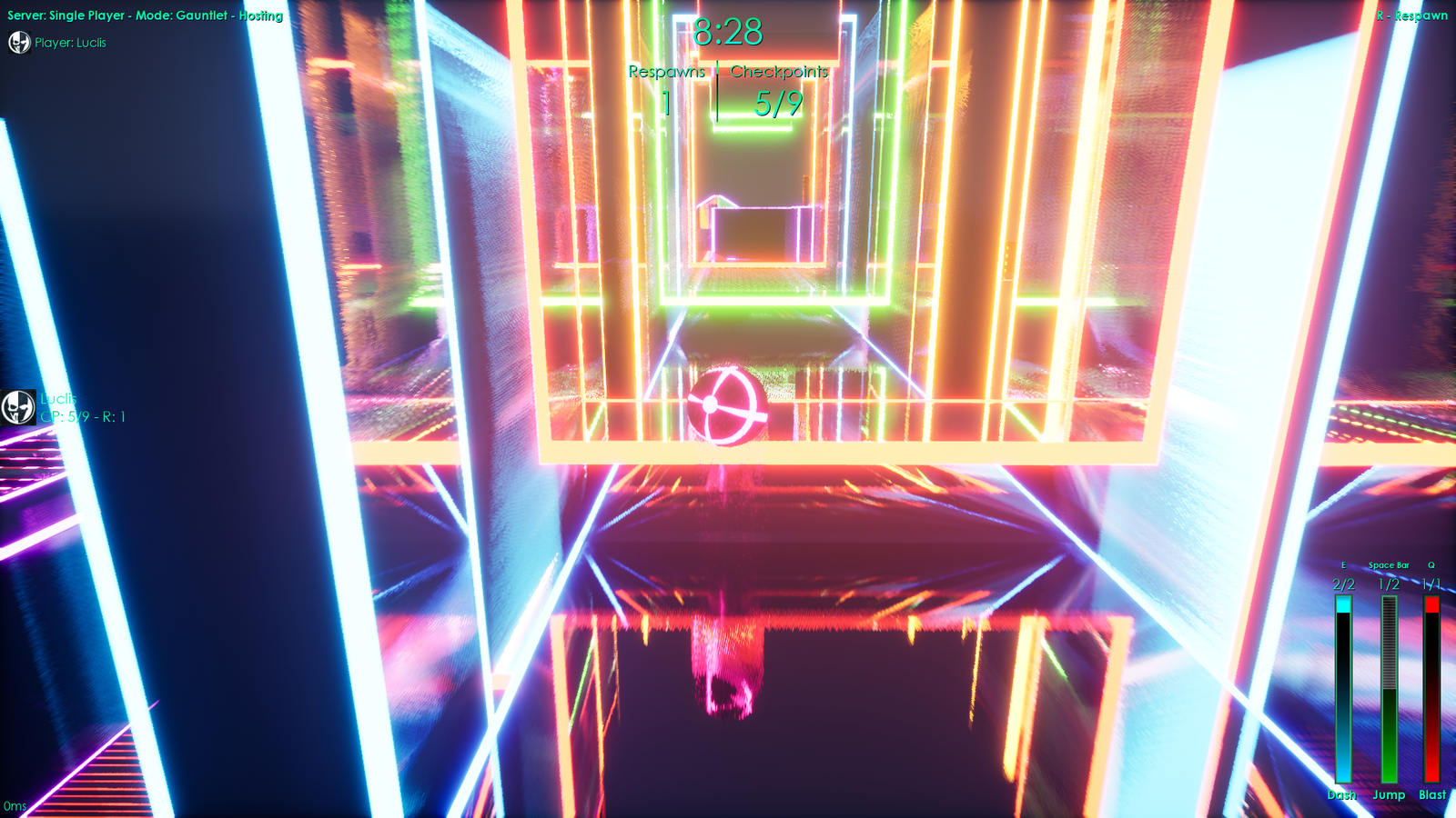 Vous l’aurez compris, il s’agit d’un jeu haut en couleur et bien difficile. En bons masochistes, nous ne pouvons qu’apprécier ces deux points. Seulement, un autre facteur vient obscurcir le tableau. Kinetic Edge est le genre de jeu à jouer en multijoueur. Actuellement, nous n’avons pas réussi à trouver des salles de jeux multi, aussi le jeu devient rapidement répétitif. Une fois les tableaux finis, on peut se battre pour chercher à rejoindre la première place, mais c’est rapidement tout. Heureusement, Seacorp Technologie nous rassure quant au futur de son jeu en nous indiquant les prochaines étapes de développement. On peut toutefois regretter qu’il n’y ai pas moyen de jouer avec un ami en écran partagé. Néanmoins, notre verdict est voué à changer le jour où il y aura suffisamment de monde pour faire une partie en ligne.