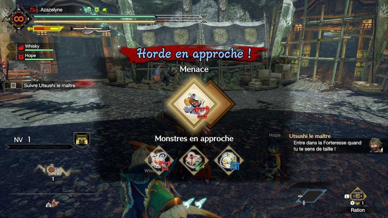 Premier lancement de jeu, arrivée dans le village Kamura. Ce village est particulier, le ton est donné. Il est isolé, possède ses propres lois et coutumes, et surtout, il doit se défendre contre des monstres. Tout tournera donc autour de ça : la chasse aux créatures. Après avoir choisi votre type d’arme parmi les 14 proposés, il va falloir faire ses preuves! Mais les villageois seront là pour vous aider dans votre tâche. En effet, un forgeron vous permettra d’améliorer vos armes et vos armures. Les pilpoils vous accompagneront dans vos chasses pour vous seconder. Des repas spéciaux sont à disposition pour augmenter vos statistiques. Dès le village, on peut voir que, pour de la Nintendo Switch, le jeu est joli graphiquement. Les connaisseurs de la licence sont donc en terrain connu. Faire son équipement, l’améliorer, l’optimiser, et aller chasser.