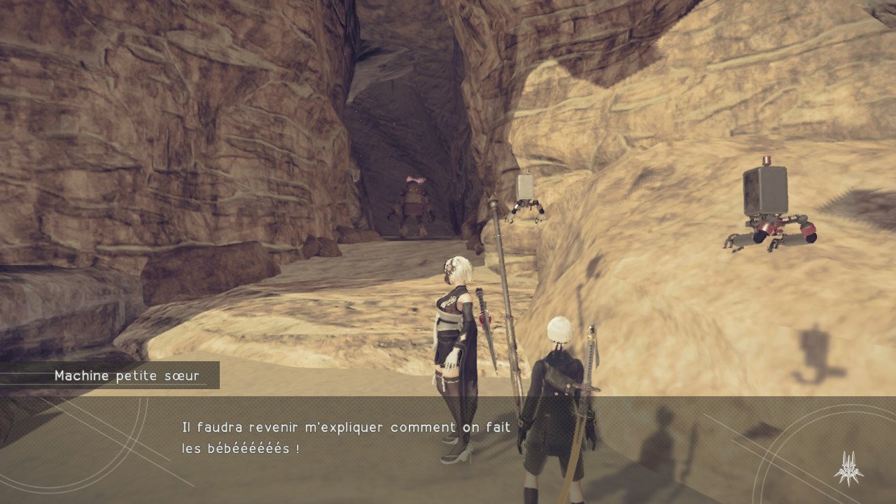 Arrêtons donc là en ce qui concerne le scénario, tout spoil étant criminel tellement celui-ci est magnifiquement écrit et amené. NieR : Automata est vraiment un jeu unique en termes de narration. Sachez juste que plusieurs « runs » ou « loop » seront obligatoires afin de cerner l’histoire dans son ensemble. Beaucoup de fins sont atteignables et doivent être atteintes, cela faisant partie intégrante de la narration. Nous jouons plusieurs personnages à tour de rôle et il est très important de vraiment s’impliquer sous peine de ne rien piger. Ce titre a un côté très philosophique et amène une profonde réflexion sur le cycle de la vie et de la mort. En plus d’être un superbe divertissement, il fait réfléchir le joueur, le forçant à se poser des questions existentielles. Ce jeu peut vraiment s’apparenter aux meilleurs romans de science-fiction.