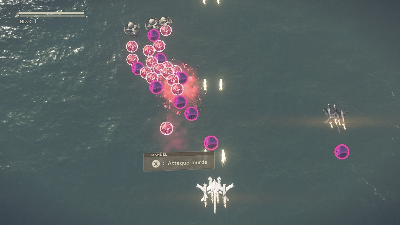 En plus d’être unique dans l’histoire qu’il raconte et sa manière de le faire, Nier : Automata amène un gameplay vu nul part ailleurs. Accrocs de shoot ’em up, réjouissez-vous ! Nous avons là un RPG qui pioche énormément dans ce genre de niche que nous aimons tant. Certains boss nous envoient des vagues de boulettes dignes des meilleurs danmaku, bullet-hell ou encore manic-shooter, au choix. L’introduction ainsi que d’autres passages se déroulent d’ailleurs en mode pur shmup à bord d’un vaisseau pouvant se transformer en mecha. Le gameplay passe alors en mode twin-stick shooter .Oui, RPG, shoot ’em up et twin-stick shooter peuvent faire bon ménage. C’est étonnant, original et donc génial. Hormis ces moments malheureusement assez rares, les combats se passent en temps réel tel un Bayonneta et autres jeux du type. Nous enchaînons les combos ravageurs à l’aide d’armes diverses. Epées courtes, longues, énormes haches, gants de combat, etc… Il y’a de quoi faire et nous pouvons nous équiper de deux armes en même temps. Les combats sont vraiment nerveux et c’est avec un réel plaisir que nous détruisons du robot à la pelle. En plus de cela, un petit module volant, un pod, nous accompagne et permet de mitrailler à très longue distance. Il est possible de lui assigner une option comme un gros tir laser, une rangée de lances sortant du sol, le déploiement d’un bouclier… Ce genre de choses. Ce « pouvoir » a un petit temps de recharge mais est vraiment utile. Le joueur prend vite le coup d’entamer les affrontements en utilisant son pod dès qu’il aperçoit des ennemis au loin. Franchement jouissif.