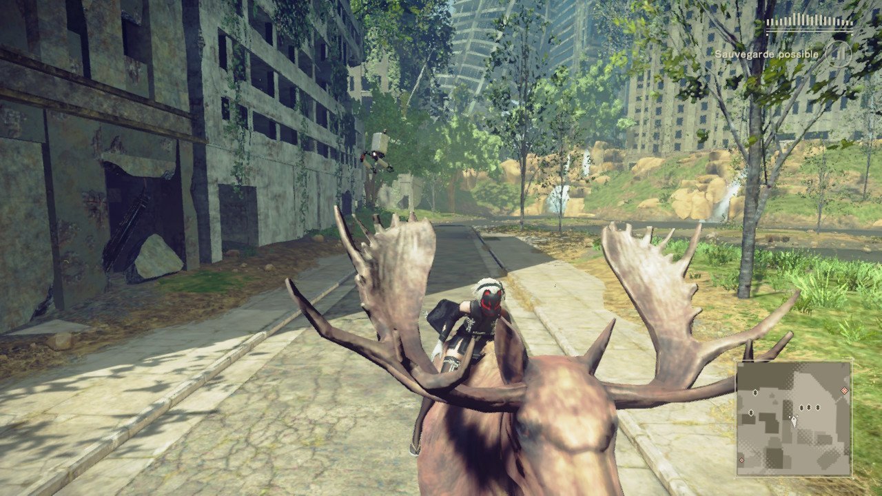 Disons le de suite, la direction artistique fabuleuse est sublimée par une technique aux petits oignons. Voilà, au revoir… Bon, développons un peu. Sérieusement, les amoureux d’ambiances sci-fi ne pourront qu’être aux anges. Le monde que nous parcourrons est fait de débris de vie humaine perdus au milieu d’une Nature ayant depuis longtemps repris ses droits. Les différents lieux recèlent tous une part de mystère et poussent à l’exploration. Nous avons envie de tout voir, de fouiller partout. C’est d’ailleurs là l’un des seuls défauts du soft. Trop d’endroits sont « clôturés » ou plutôt bien délimités. Par exemple, nous aurions aimé pouvoir visiter chaque bâtiment mais même si certains passages dans les décombres nous permettraient d’entrer, un mur invisible nous en empêche. Le monde de NieR : Automata est tellement plaisant à parcourir que nous en demandons trop. Platinum Games et Square Enix poussent déjà la petite Nintendo Switch dans ses retranchements pour offrir aux joueurs une expérience hors du commun. Bien entendu, si nous regardons chaque petit détail de près, chaque feuille d’arbre ou chaque caillou, nous pouvons trouver quelques textures baveuses ici ou là mais l’ensemble est juste un régal pour les yeux. Tout de force, aucun ralentissement ne se fait sentir ni aucun clipping. Nous apercevons nos ennemis au loin et pouvons interagir avec eux (les mitrailler) sans souci. Chapeau. Dans la ludothèque de la console hybride, NieR : Automata se range aux côtés des Xenoblade Chronicles ou encore Zelda : Breath of the Wild sans avoir à rougir.