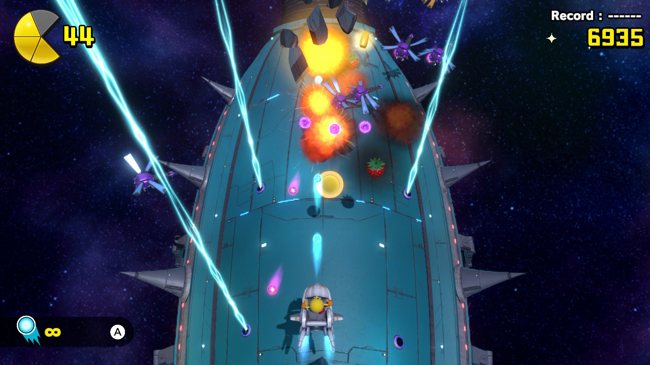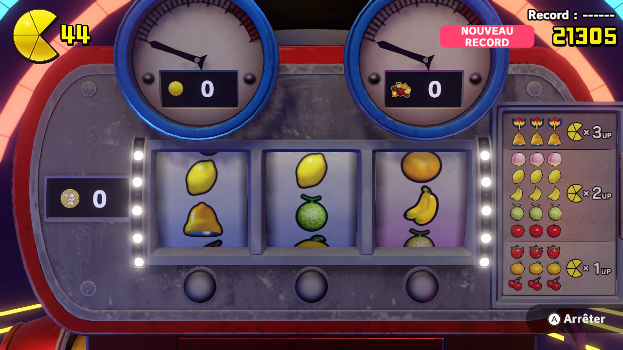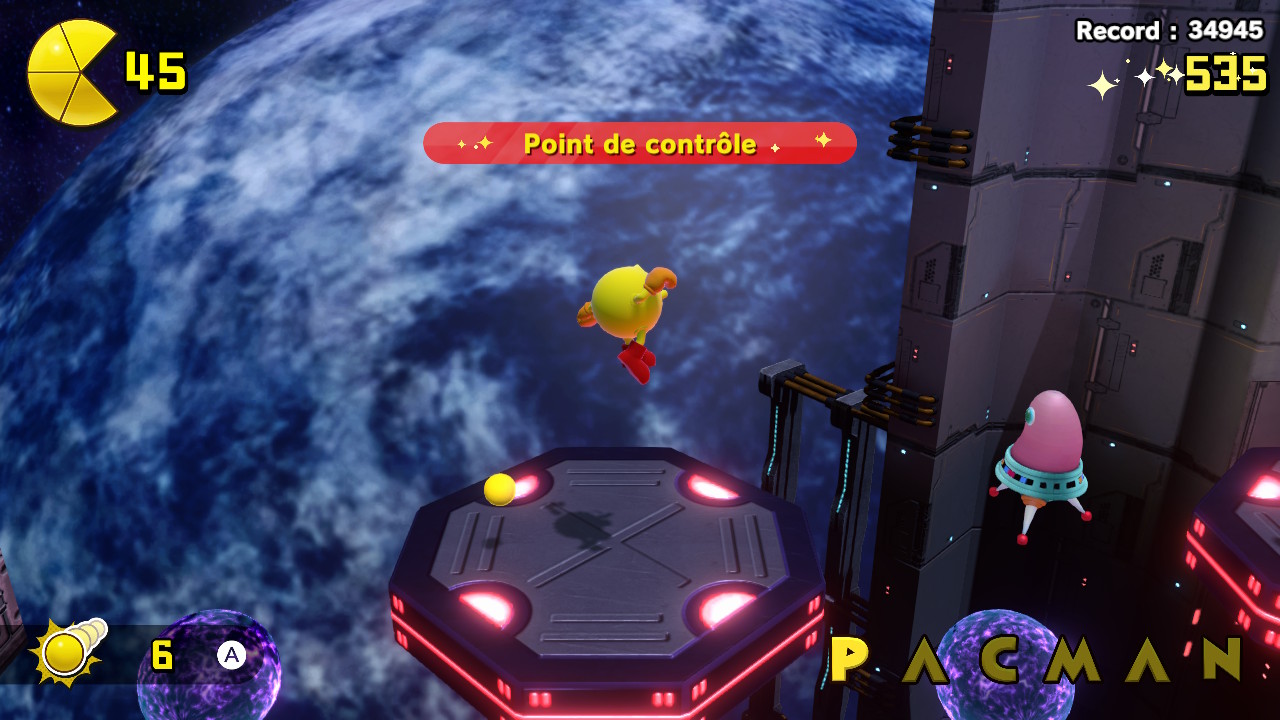 La maniabilité de PAC MAN WORLD Re-PAC est parfaite. Notre héros cours, saute et rebondit sans aucun accroc. Le seul reproche que nous pourrions lui faire serait qu’il n’est parfois pas simple de viser lorsque nous envoyons une bille sur ennemi. Nous avons d’ailleurs deux moyens de nous en défaire. Sauter er réappuyer sur le bouton nous fait faire une sorte de dash vers le bas. La chose permet de rebondir plus haut pour atteindre certains endroits ou alors d’écraser les méchants. Nous ramassons des petites billes jaunes dans les niveaux, PAC MAN oblige, et celles-ci servent au scoring mais également comme projectiles. C’est donc à certains moments un peu compliqué de viser juste dans cet environnement en 3D. Mais rien de bien grave. Réellement, le gameplay se veut fluide et instinctif même lors de certaines phases de plateforme chronométrées faisant monter le stress. Un bonheur. Nous avons même le droit à une phase de shoot ’em up qui est tellement cool qu’elle mériterait un jeu à part entière. Et à chaque fois que vous finirez un niveau, vous aurez accès à une « machine à sous » servant à gagner des vies supplémentaires. En bref, il y’a de quoi faire.