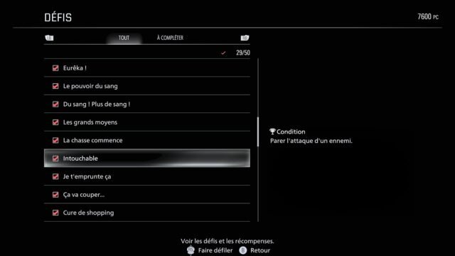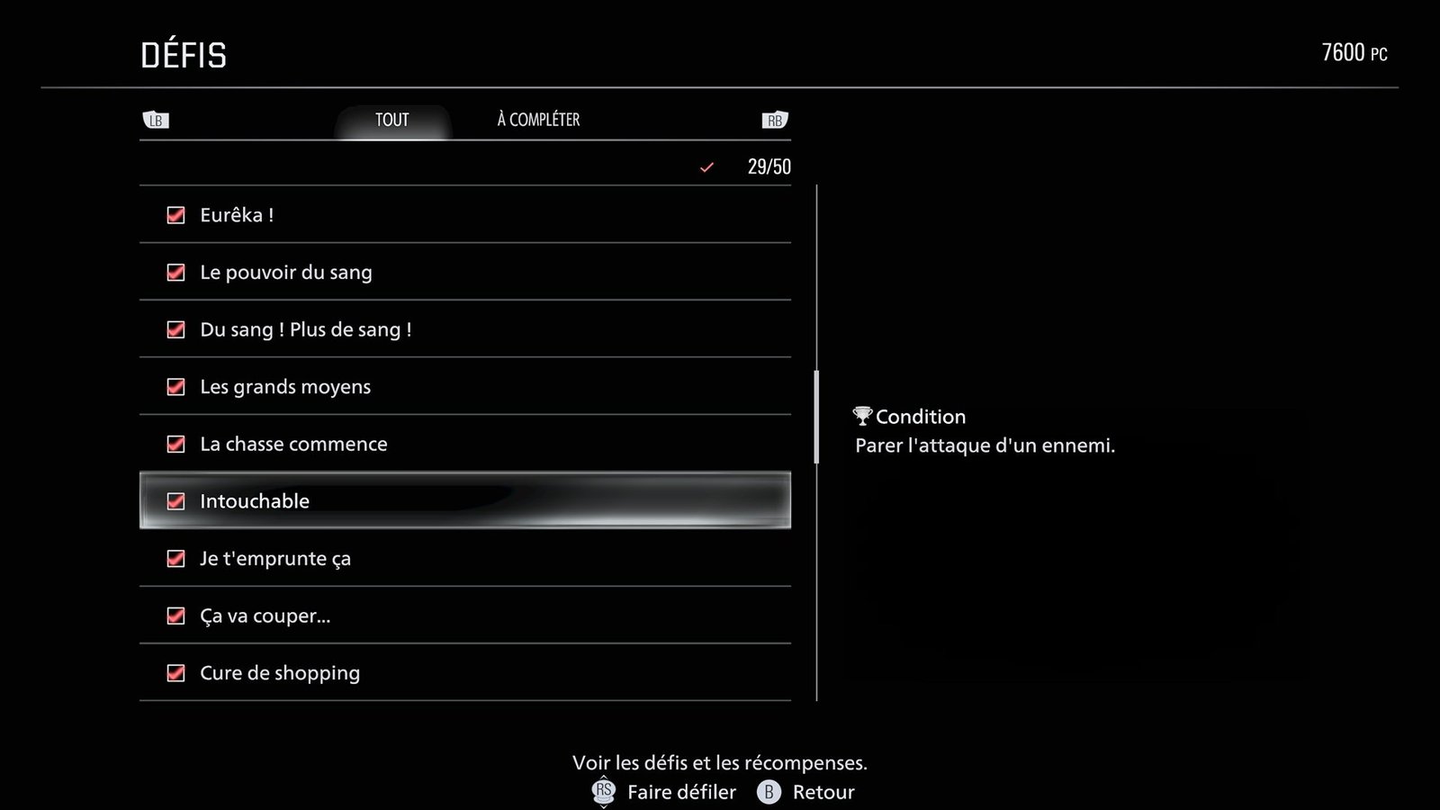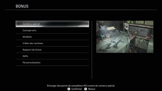 Bien évidemment, comme la plupart des Resident Evil, les collectibles ne sont pas les seules choses à trouver. Il faut également finir des défis qui vous permettront d’accumuler des points nommés PC, et ceci pourront vous servir une fois le titre terminé !En effet, lorsque vous aurez fini Resident Evil, vous disposerez d’une ligne supplémentaire dans le menu permettant de déverrouiller les bonus, et ceux-ci sont nombreux. Avec vos points PC, vous aurez la possibilité d’acheter des tenues pour Leon et Grace. Vous aurez également la possibilité d’acheter des armes pour recommencer l’aventure avec des armes surpuissantes telles que le légendaire RPG. Masi surtout cela vous donnera la possibilité de voir les défis pour avoir de nouveaux point PC et acquérir un porte-bonheur permettant une meilleure puissance de feu, ou tout simplement acheter des artworks du jeu de qualité.