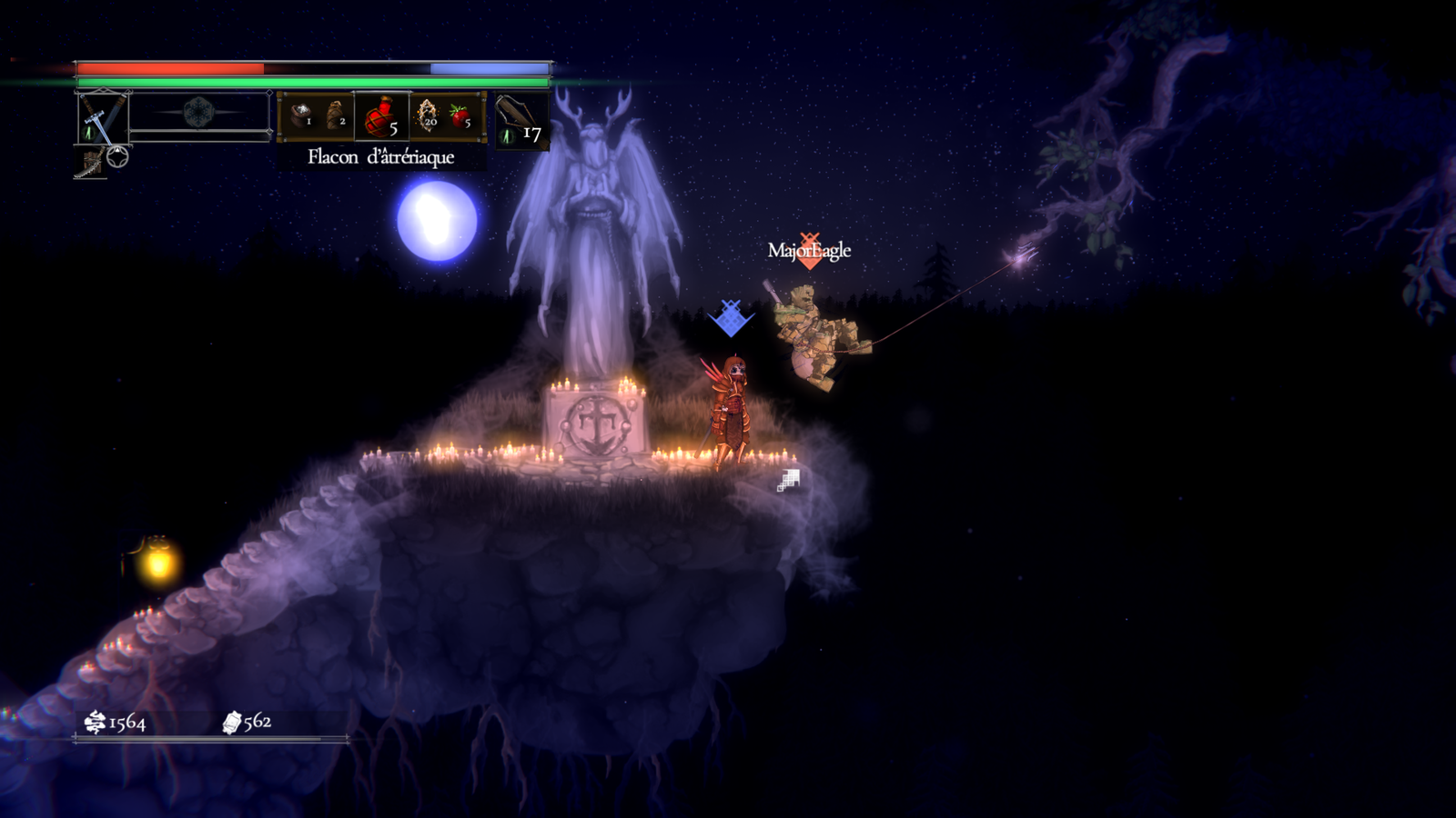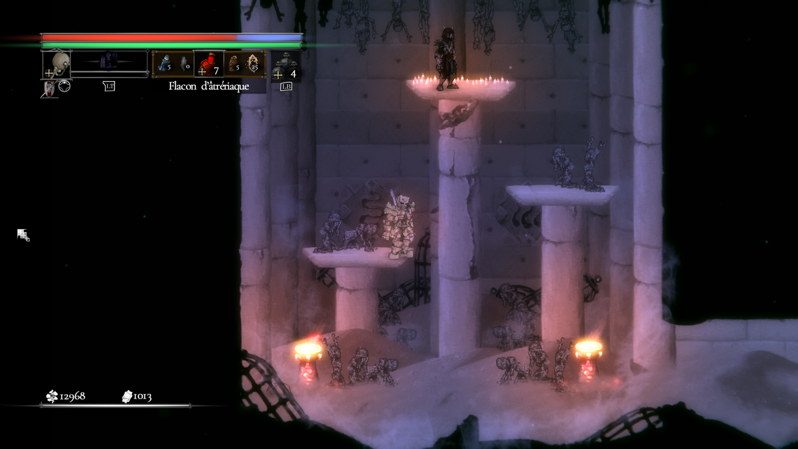 Bien que la mort fasse partie du jeu, et que de par sa prestigieuse ascendance, le jeu doive être pris au sérieux question difficulté, il faut dire que de nombreux sanctuaires jalonnent notre route. Ces pierres permettent de se soigner intégralement, sans limites d’utilisation et constituent des checkpoints salutaires durant notre exploration. Ainsi, si la mort venait à nous cueillir (et elle le fera volontiers), nous serions assurés de ne pas réapparaître trop loin de notre tache de sang. Encore une fois, à la manière d’un Dark Souls, il est possible de récupérer sel et argent en parvenant à revenir sur les lieux de notre précédent décès. Car effectivement, en tant qu’être maudit, nous avons la possibilité de renaître à l’infini. Le jeu comportant des combats ardus, des pièges retors et des phases de plateformes vertigineuses, les occasions de passer de vie à trépas ne manquent pas. Mais le fait d’utiliser le sanctuaire n’interfère pas avec la poursuite de notre traque. En clair, cela ne nous oblige pas à revenir à zéro. Ainsi, on se retrouve parfois avec la sensation d’abuser un peu des checkpoints.