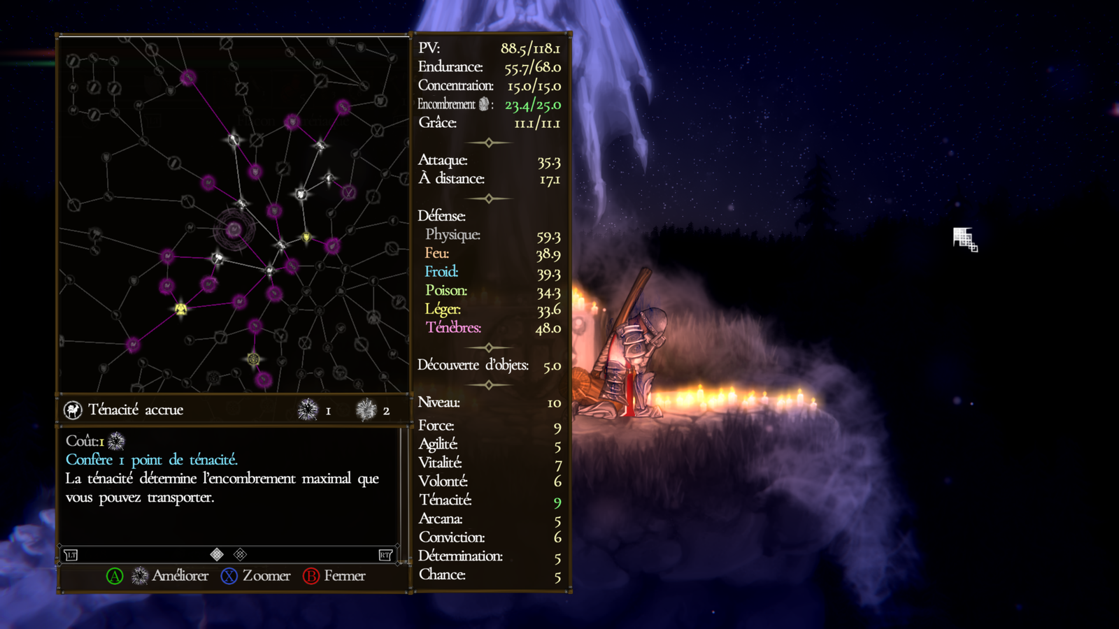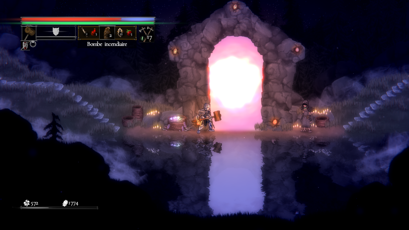 Abordons à présent un point qui, bien qu’il puisse paraître accessoire, avait clairement laissé à désirer dans le premier opus. Disons-le donc tout de go : cette fois-ci, la traduction en français est de qualité. Oubliés les édifiants écueuils de Salt and Sanctuary ! La langue de Molière met à présent en lumière l’ambiance ombrageuse du jeu. Le ton est fort à propos et, comme mentionné plus haut, les dialogues sont bien jaugés. En parlant d’ambiance, arrêtons-nous un instant sur la qualité sonore du jeu. Là encore, ce fut un point qui fit parfois l’objet de critiques dans le premier opus. Si nous n’étions pas de ceux qui considéraient la musique ni le sound design de Salt and Sanctuary comme ratés, nous avouerons volontiers qu’il s’agissait d’un secteur perfectible. Cette fois-ci, nous avons trouvé que la mélodie savait se faire plus présente pour rythmer les différentes phases ainsi que leurs enchaînements (temps calmes et bastons par exemple). Les bruitages sont eux aussi réhaussés pour correspondre fidèlement à l’action entreprise (clin d’oeil au bruitage du marteau qui rentre en contact avec le sol, quel délice). En bref, tous ces éléments viennent magnifier l’aventure.