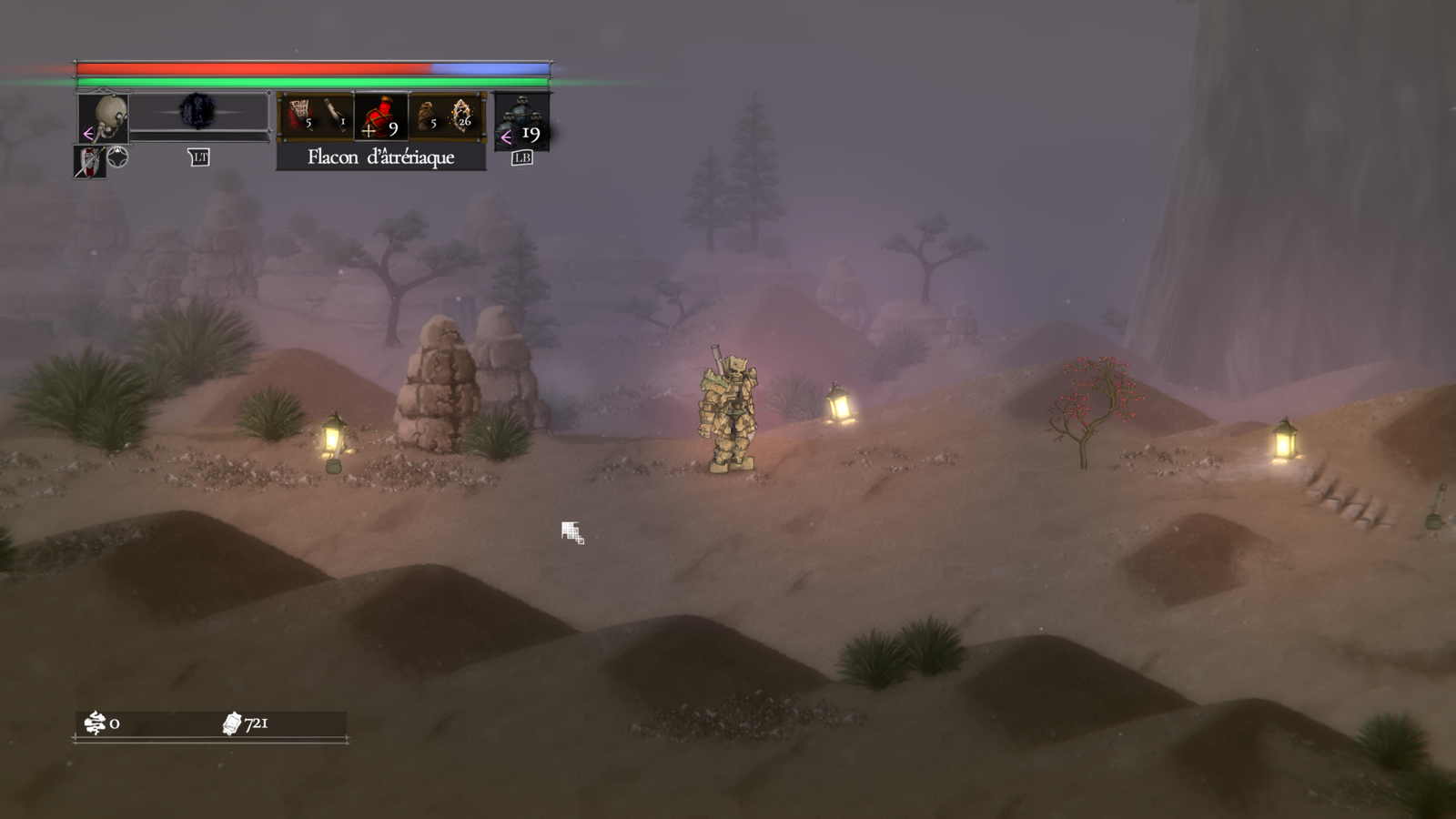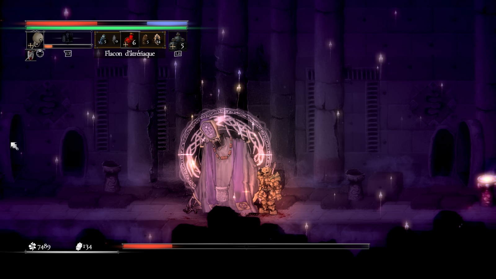 La chasse aux Mages prend la forme d’une traque avide, durant laquelle nous sommes guidés par les déplacements incessants de nos cibles. Il faut alors les pourchasser, en décimant au passage les créatures autochtones pour déclencher enfin l’affrontement final. Celui-ci est tout bonnement un Bossfight durant lequel il faut vaincre ou être vaincu. Le fait de parvenir à mettre à mort un mage est toujours assez jouissif. En dévorant le coeur, on a clairement la sensation d’accomplir quelque chose. Chacun des Boss a son identité propre, même s’il existe certaines redites au cours de l’aventure. Il est vraiment plaisant d’apprendre à éviter leurs sorts spécifiques et d’intégrer le timing de leurs assauts. La maîtrise émerge hélas de ces instants frustrants où l’on se fait balayer par un pattern jusqu’alors inconnu. Mais on revient plus fort, mieux renseigné sur notre cible, avec un équipement adapté en conséquence et bien décidé à ne pas se faire plumer une nouvelle fois. En outre, les animations des boss sont suffisamment singulières pour lui donner une identité propre. La découverte des attaques et invocations de chacun d’entre eux se fait souvent dans le sang. Il est possible que le passage, parfois obligé, par la case décès consécutif à une mauvaise lecture (ou méconnaissance) des animations puisse rebuter certains joueurs. En effet, toutes les animations ne sont pas limpides au point de délivrer la clé du succès aisément. De la même façon, certaines hitboxes ou animations de notre propre personnage se révèlent parfois rigides. Au corps à corps par exemple, on peine à savoir si les attaques frontales du boss vont parvenir à nous cueillir, et on le découvre souvent à nos dépens. Idem, durant l’exploration, le ramassage des items se fait strictement par devant. Un positionnement optimal du personnage est donc obligatoire. Le ramassage de l’argent passe toujours par une petite animation. L’ensemble de ces détails cassent parfois le rythme effréné de l’aventure.