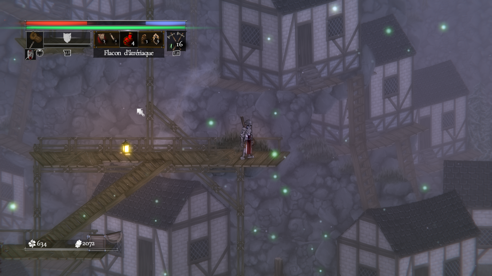 Et puis, on prend un véritable plaisir à arpenter les niveaux conçus de façon labyrinthique ainsi qu’à revenir les explorer. Car le jeu, par le biais de mécaniques saupoudrées ça et là, nous apporte des moyens d’accéder à de nouvelles zones tout au long du jeu. Ainsi, dans le plus pur style metroidvania, nous sommes amenés à redécouvrir des endroits déjà visités. On aura alors l’occasion d’y rencontrer à nouveau des Mages déjà vaincus, ce qui rendra possible le farm de leur équipement. Car si nous serons amenés à dénicher de l’équipement dans certains coffres ou à nous en remettre au item drop de certains ennemis, de nombreuses pièces proviendront de ce qu’il est possible de crafter. Grâce au savoir faire du Forgeron du Val, il sera effectivement possible de récupérer de l’équipement de qualité. Celui-ci sera confectionné à partir de matériaux relatifs à chacun des boss rencontrés. Ainsi, affronter les sbires d’un certain Mage vous permettra de mettre la main sur le stuff correspondant (armes, équipements, anneaux…). Les bonus sont très variés et correspondent à la fois à un style de jeu et à un moment de la partie. Entendez par là que certains éléments correspondront à un build early tandis que d’autres fourniront d’excellents upgrades pour les builds du lategame.