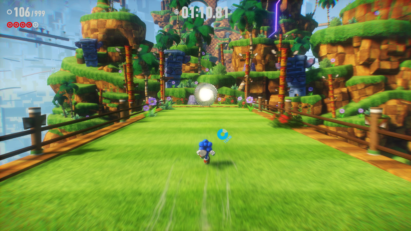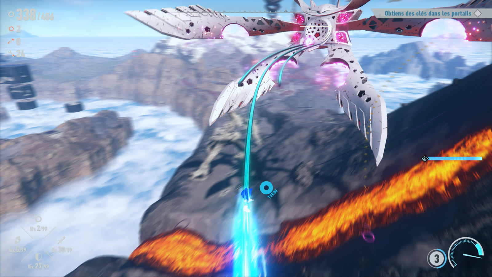 Si le jeu offre un Sonic combatif permettant d’évoluer au fil du temps dans ses attaques, il évoluera également en terme technique où Sonic pourra amasser de plus en plus d’anneaux, mais également être de plus en plus rapide, ou encore de voir ses attaques et sa défense s’améliorer. Le tout est rapidement visible en bas de l’image à gauche ci-dessous, dans une capture effectuée lors de notre mi-parcours du jeu.